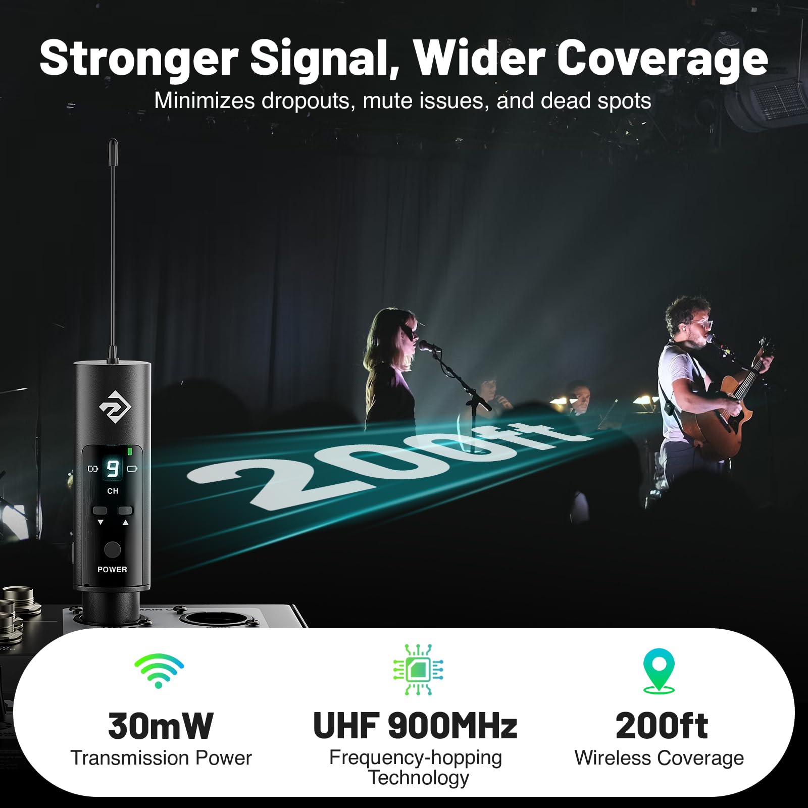 ENHANCED TRANSMISSION POWER - Powered by a UHF 900MHz frequency-hopping circuit, the IEM system offers lower latency and enhanced stability. A higher 30mW transmission power of the in-ear monitor system minimizes dropouts, mute issues, and noise caused by dead spots, making it reliable even in large or interference-heavy environments. This also enables a longer transmission range of 160-200ft, giving you greater freedom of movement on stage without compromising audio quality