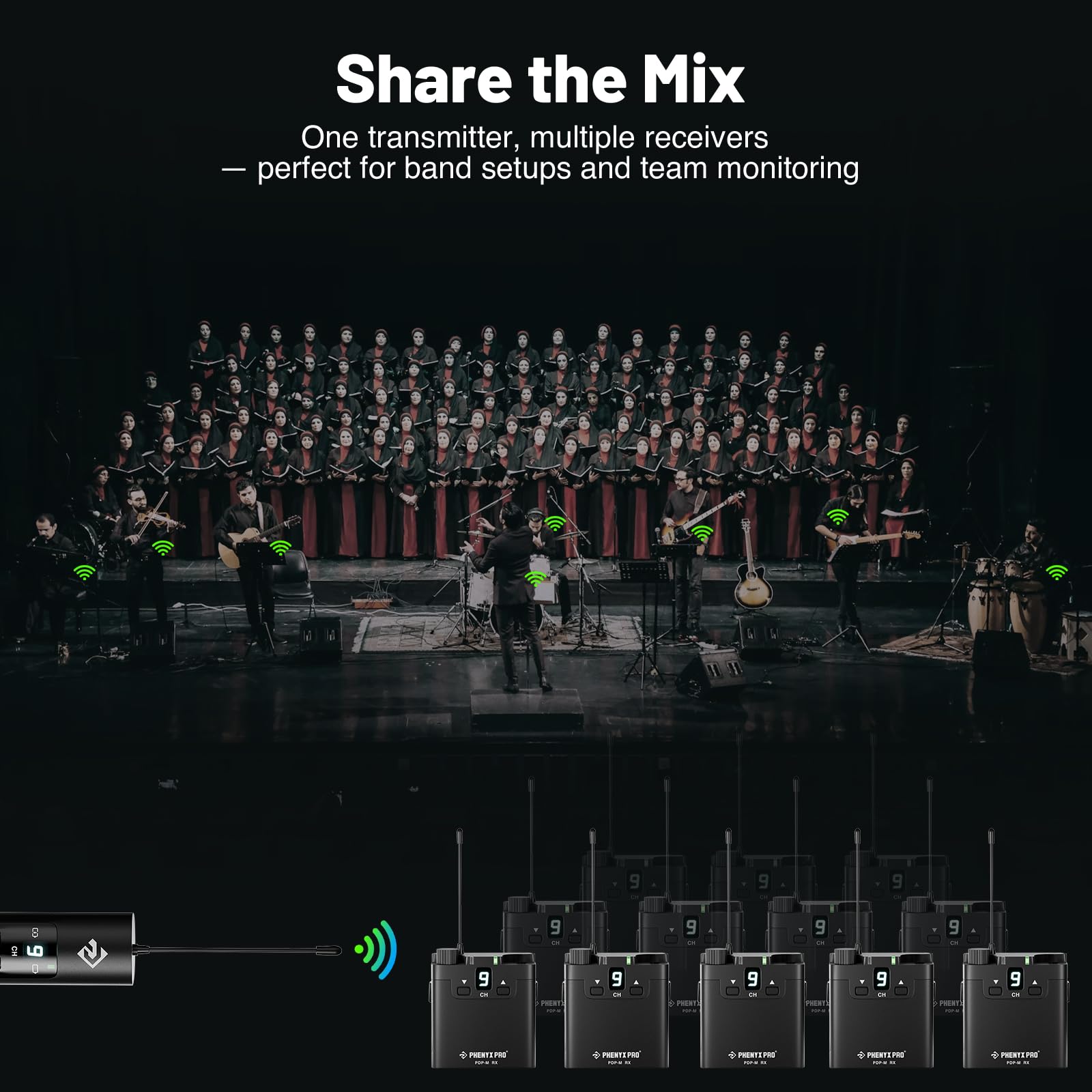 SCALABLE AUDIO SETUP - With 16 selectable UHF frequencies of the wireless audio transmitter and receiver, you can quickly switch to a clean frequency whenever interference occurs, ensuring smooth and uninterrupted monitoring during live use. One transmitter can connect to multiple receivers simultaneously, ideal for group performances, rehearsals, or worship teams—enabling a more scalable and flexible monitoring setup