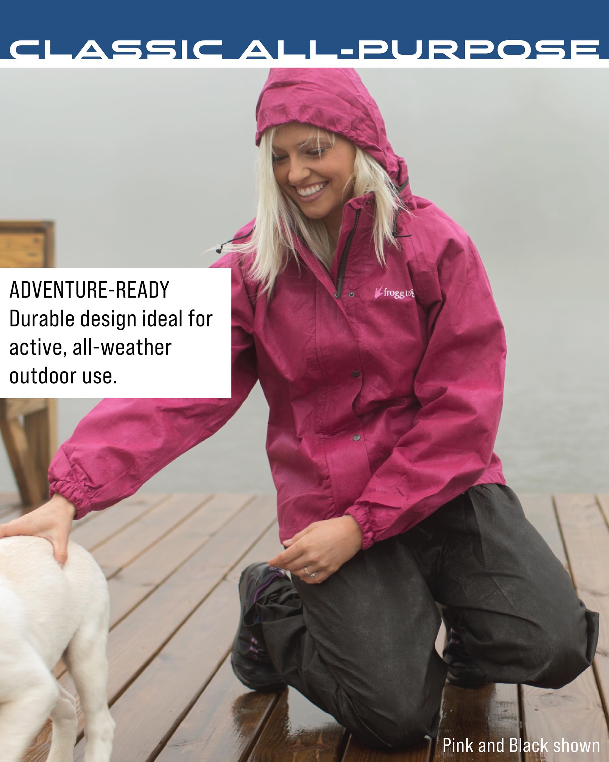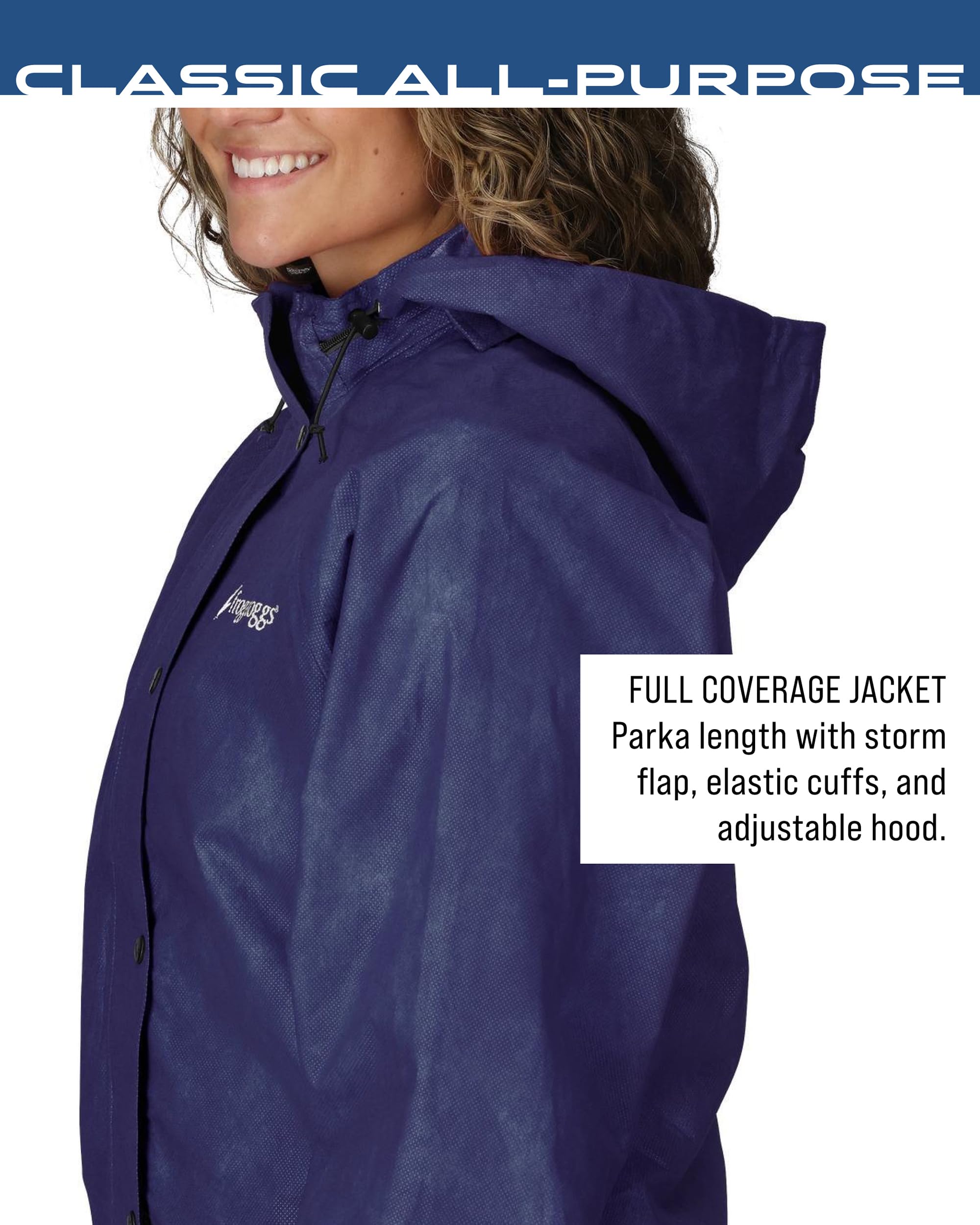 Description The All Purpose Rain Suit is a blend of classic Frogg Toggs nonwoven materials that provides great waterproof and breathable performance rain suit at a terrific value. The rain suit features fully taped seams, adjustable/removable hood, full length parka designed to fit over pants to avoid runoff transfer, raglan sleeves for greater range of motion, E-Z push cords to loosen/tighten waist, jacket features zip as well as snap down storm flap and elastic cuffs for secure fit, pant features adjustable elastic waist and adjustable leg openings.
