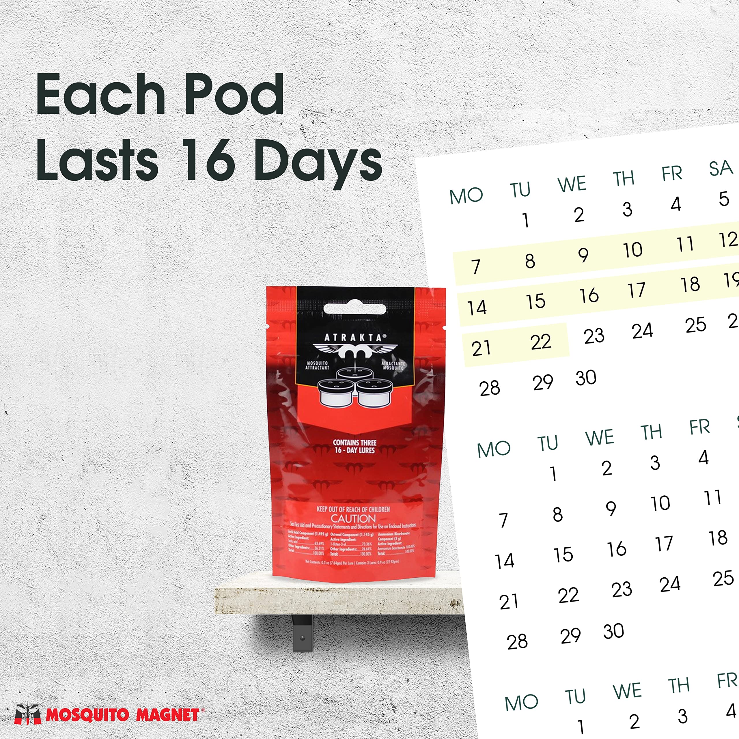Includes 3 ATRAKTA pods and an adapter for Mosquito Magnet Traps