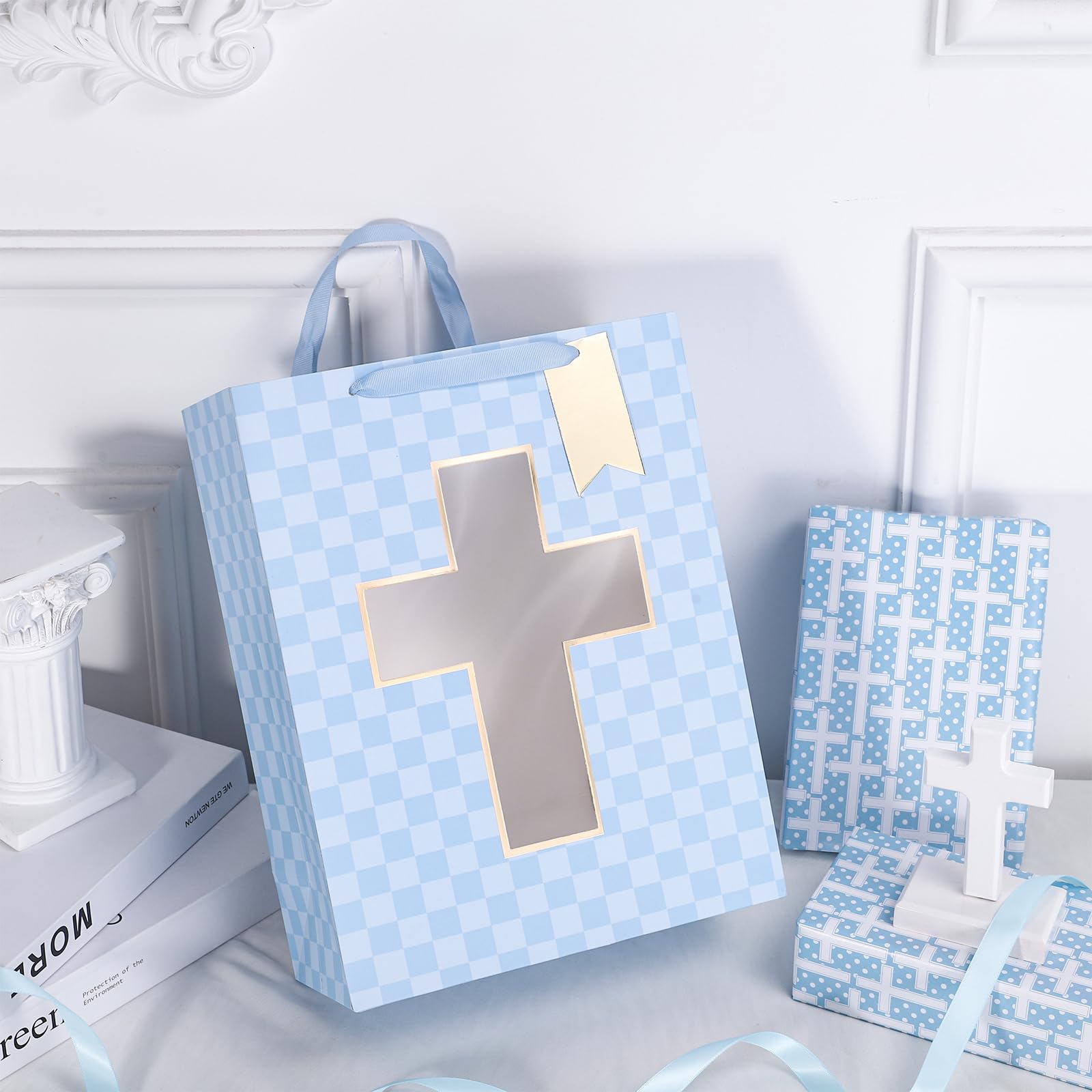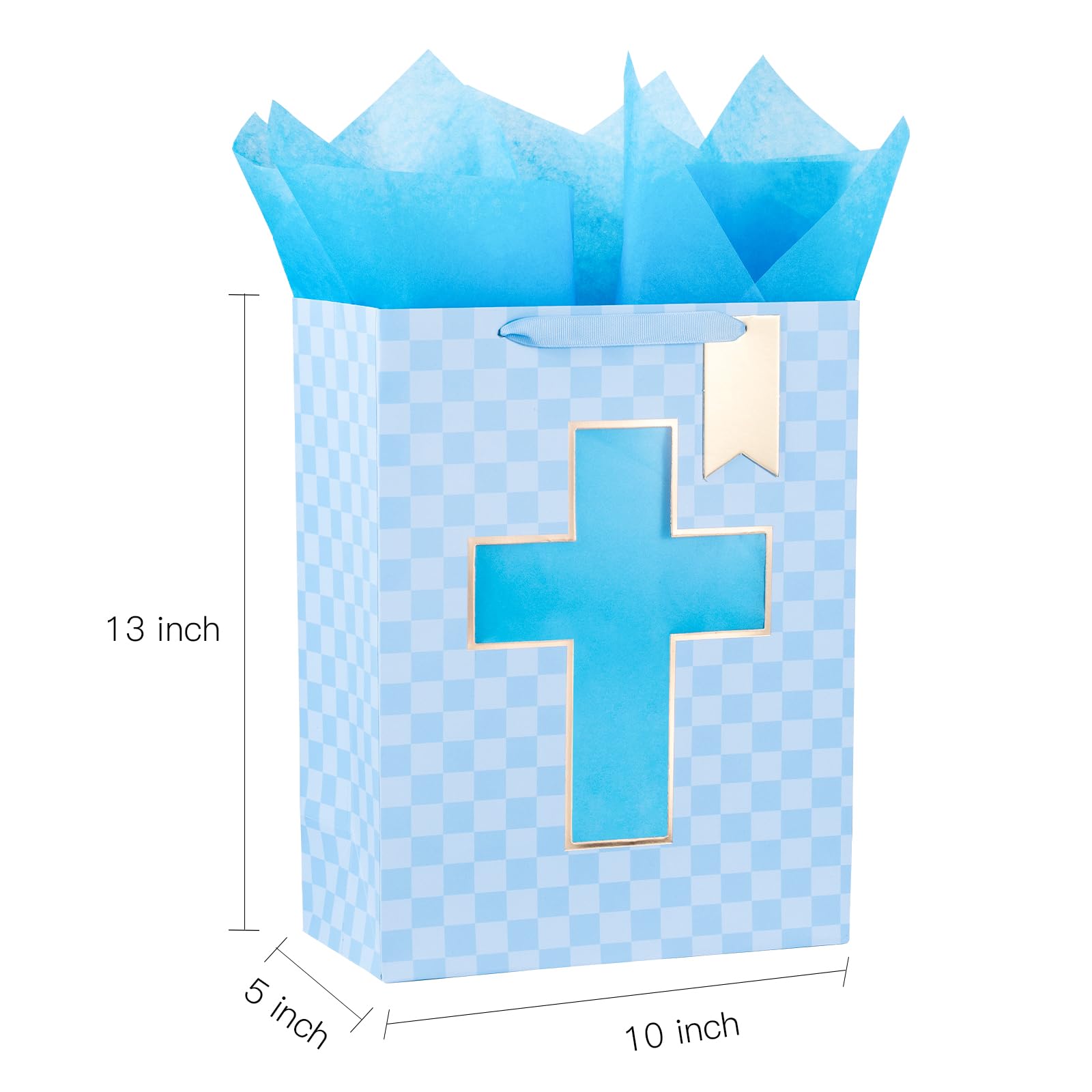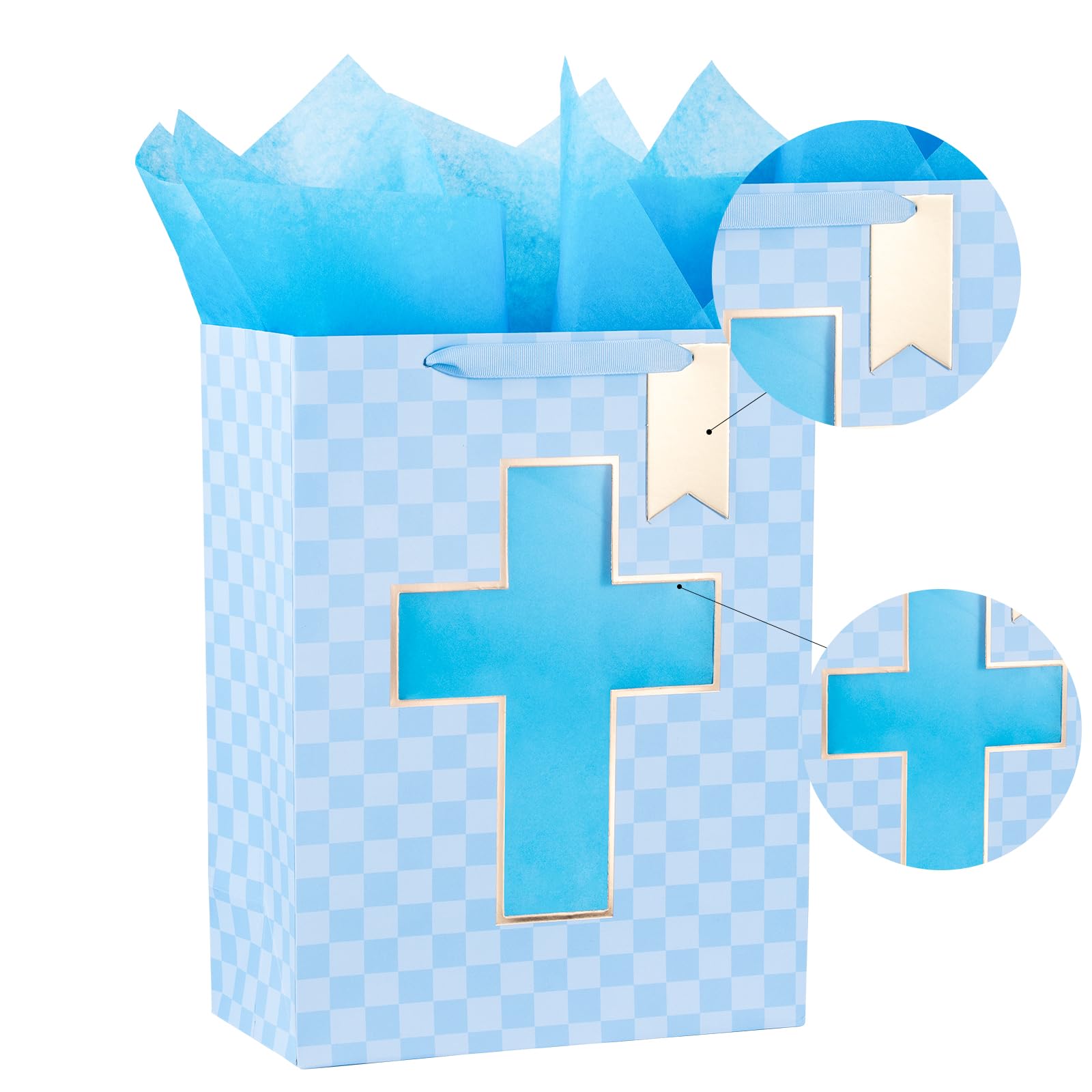 FEATURES: Gift bag with the gold foil cross cut window, lettering on blue diamond background, comes with nice ribbon handles and supportive reinforced bottom