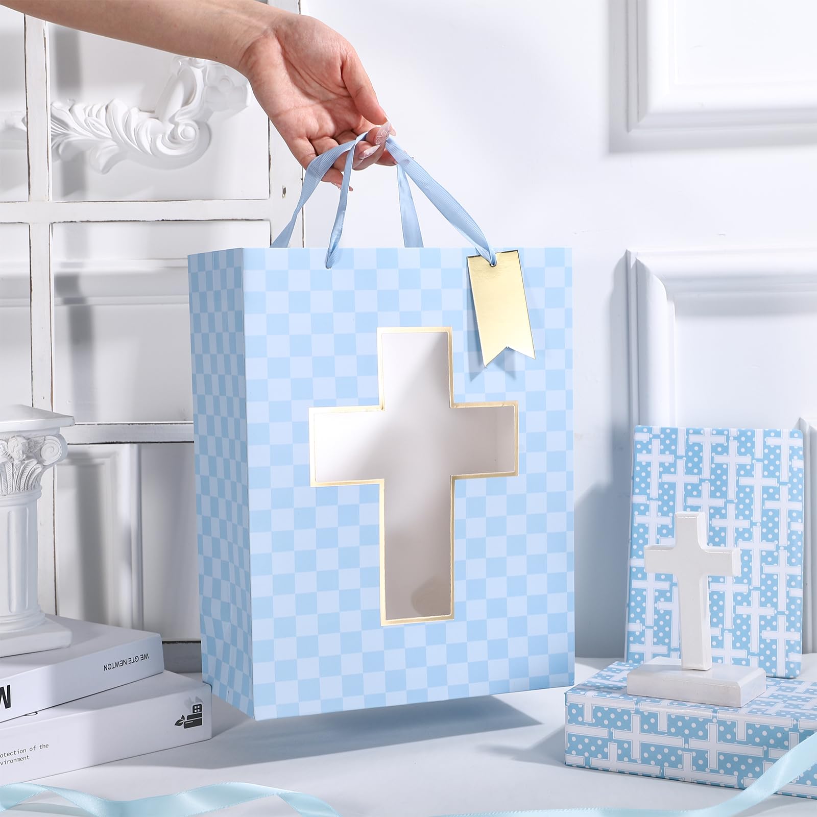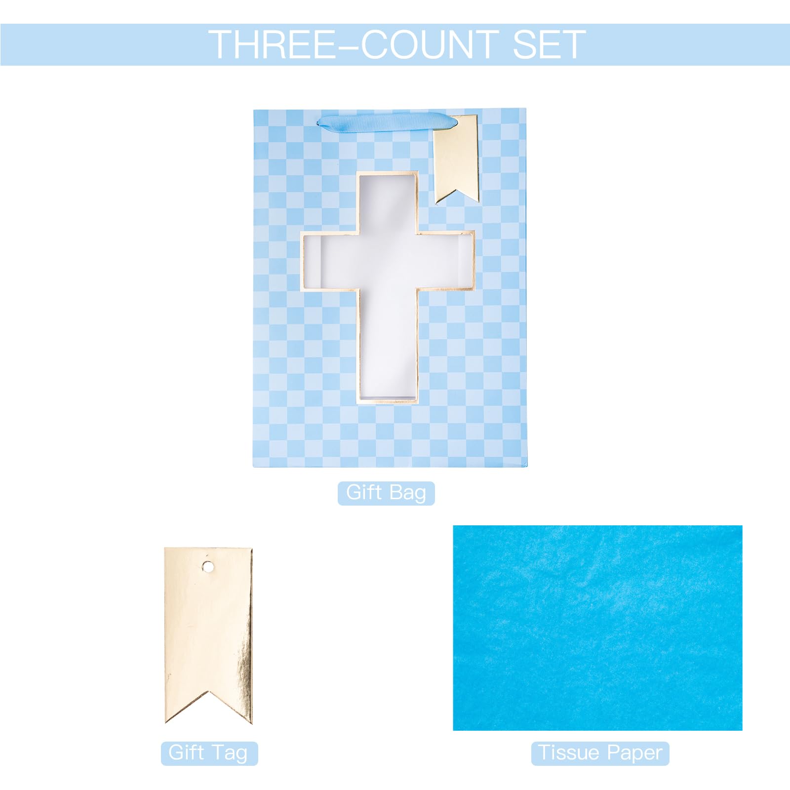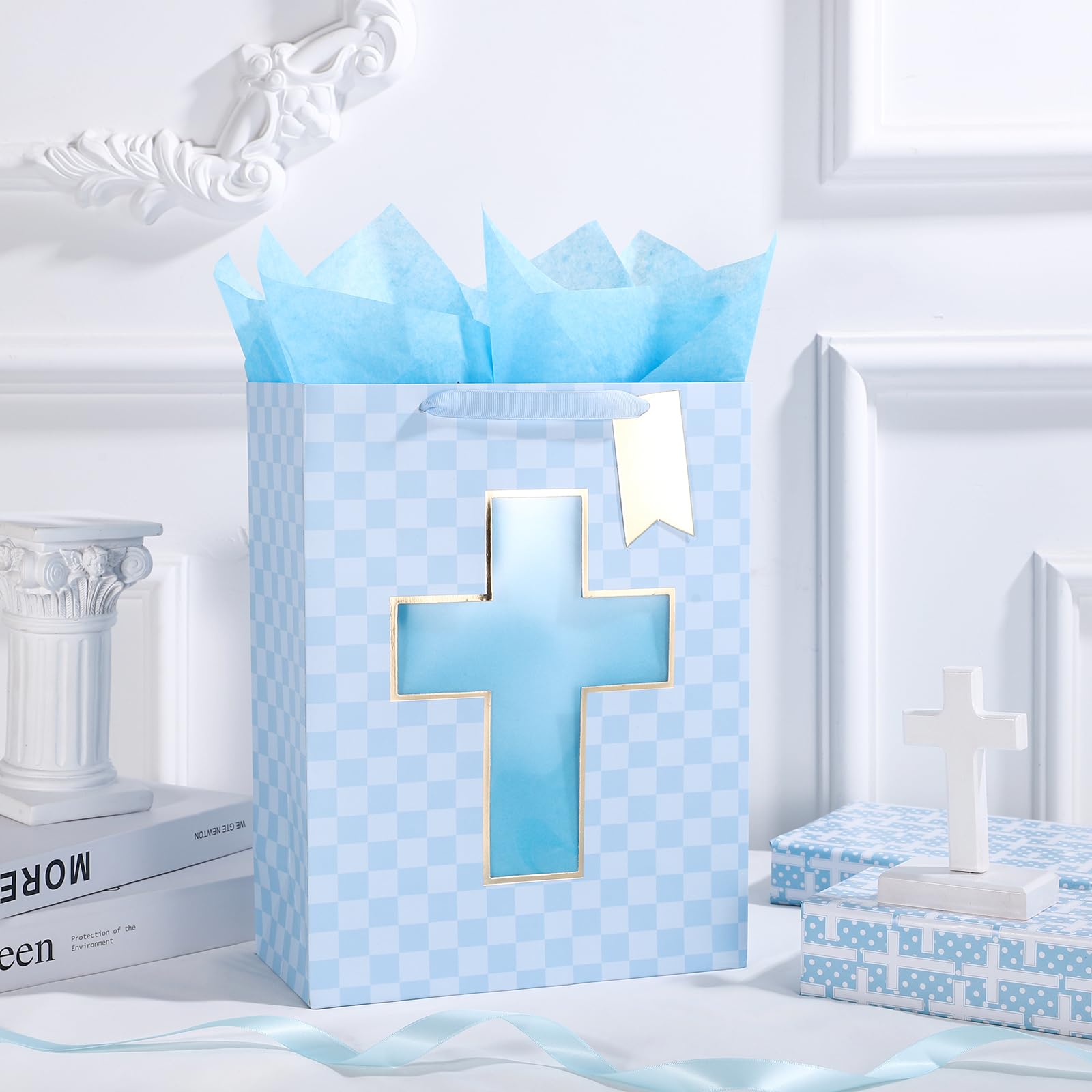 FEATURES: Gift bag with the gold foil cross cut window, lettering on blue diamond background, comes with nice ribbon handles and supportive reinforced bottom