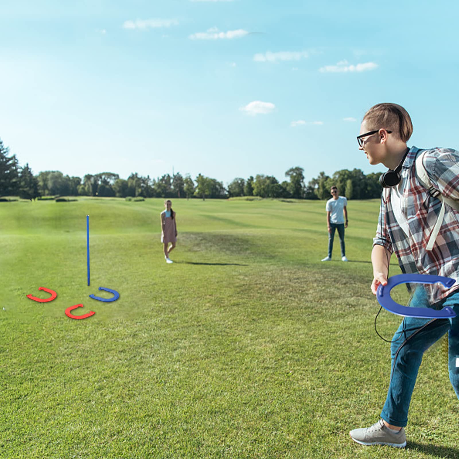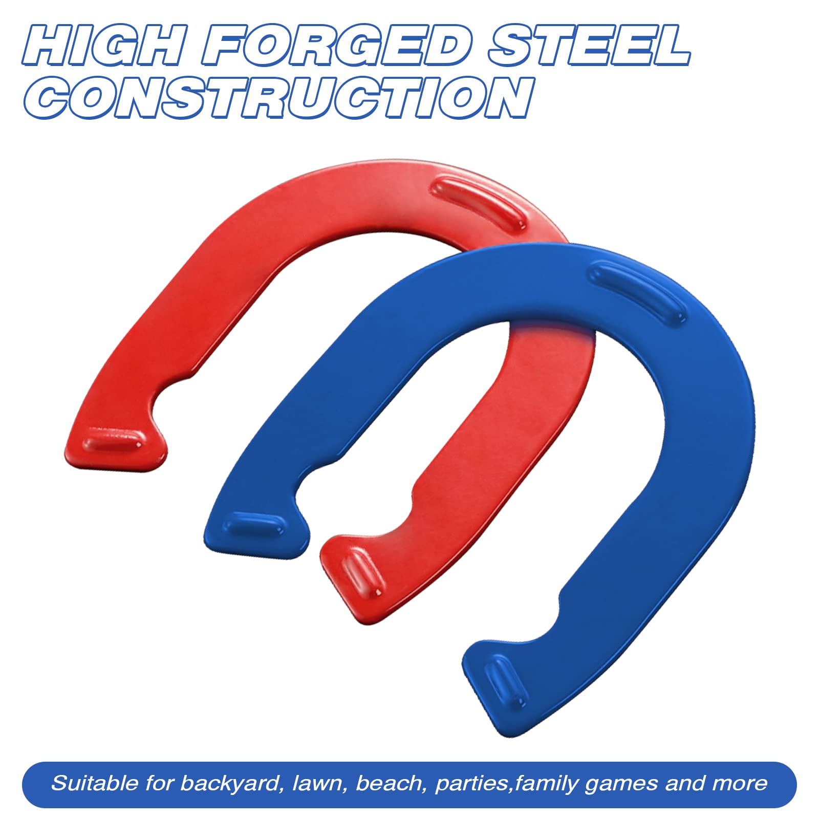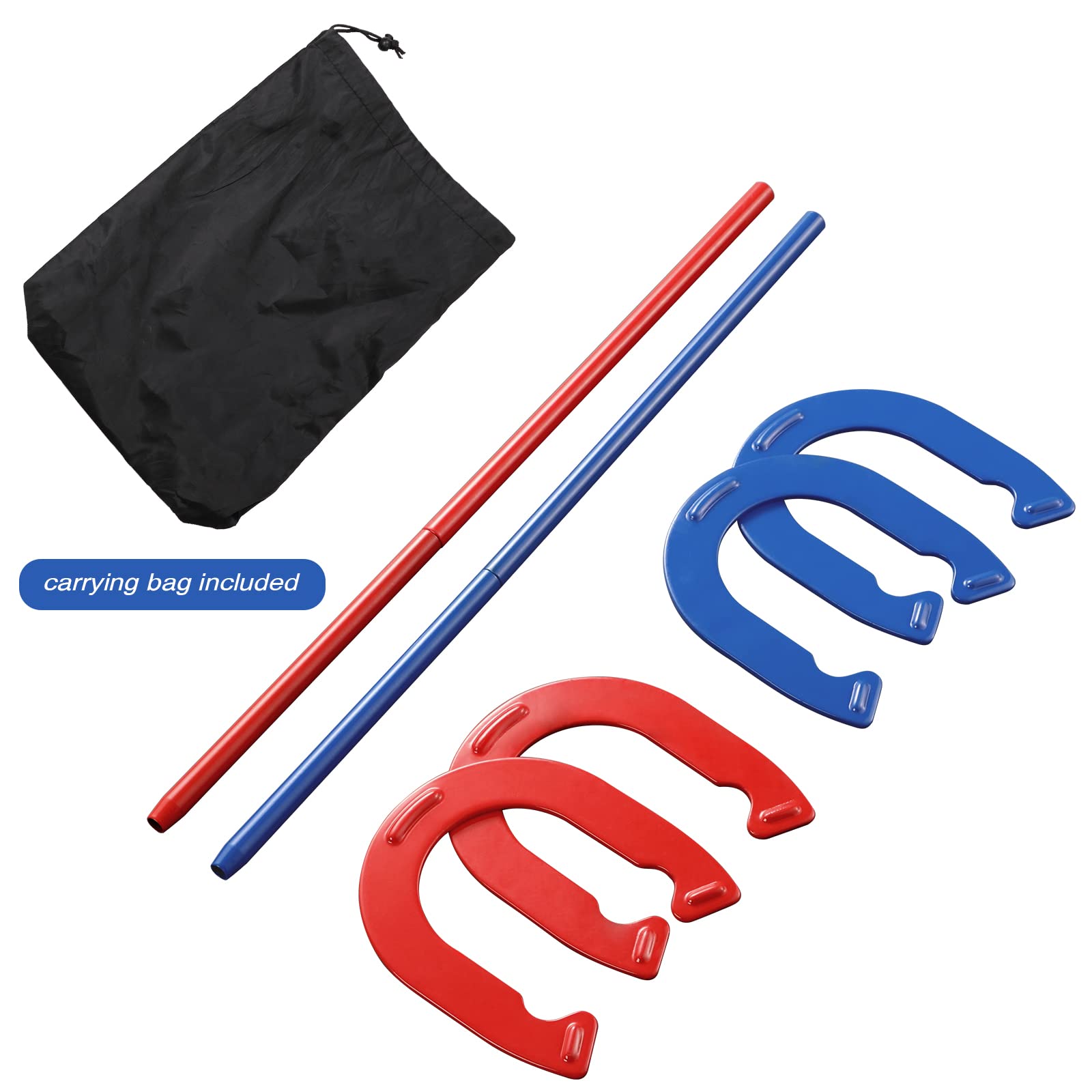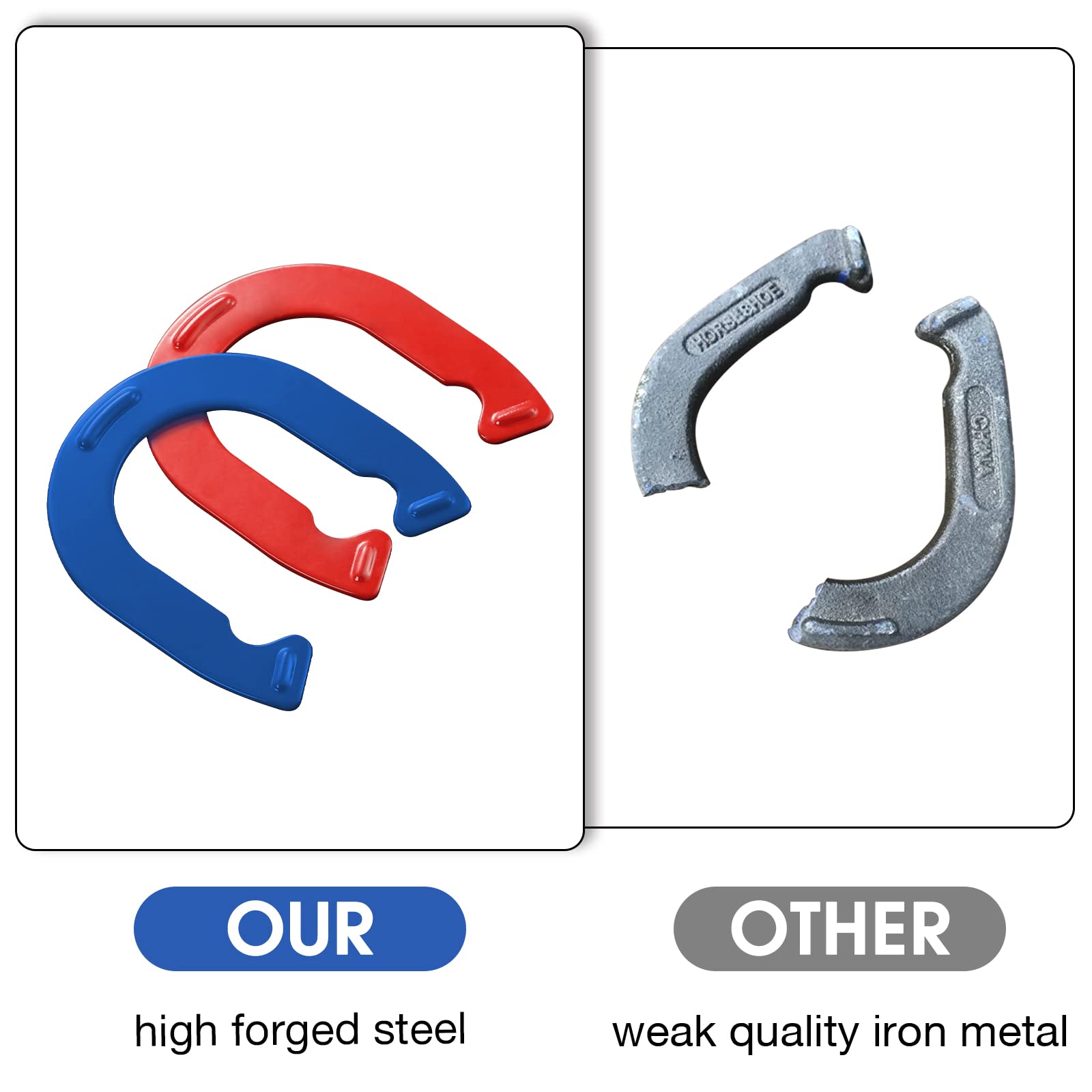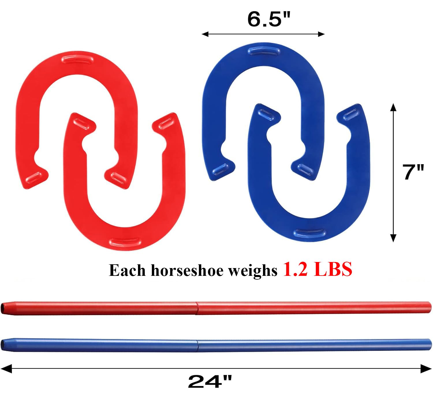 Horseshoe Set: this horse shoe game kit include forged steel 4 horseshoes (2 blue, 2 red), 2 stakes, the height of the stake is 24 inch, black bag also include convenient for you to store or carry it