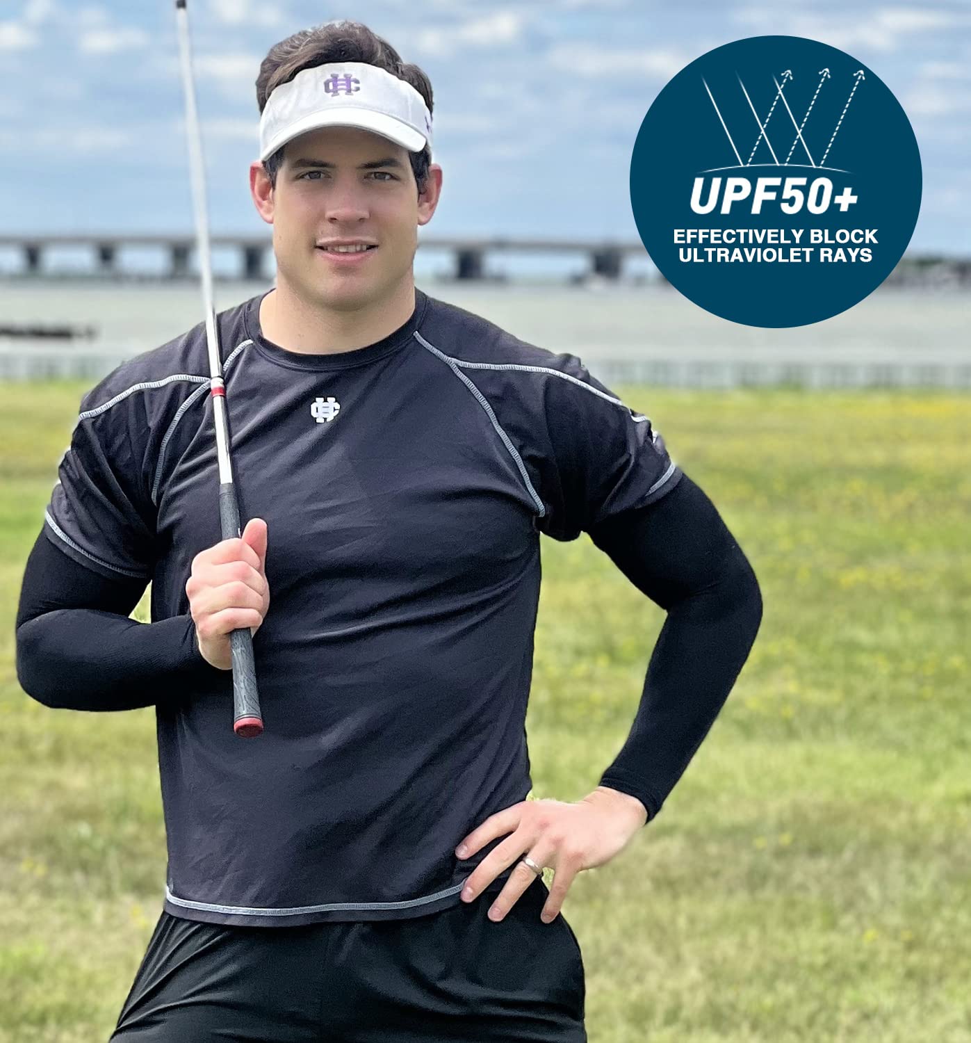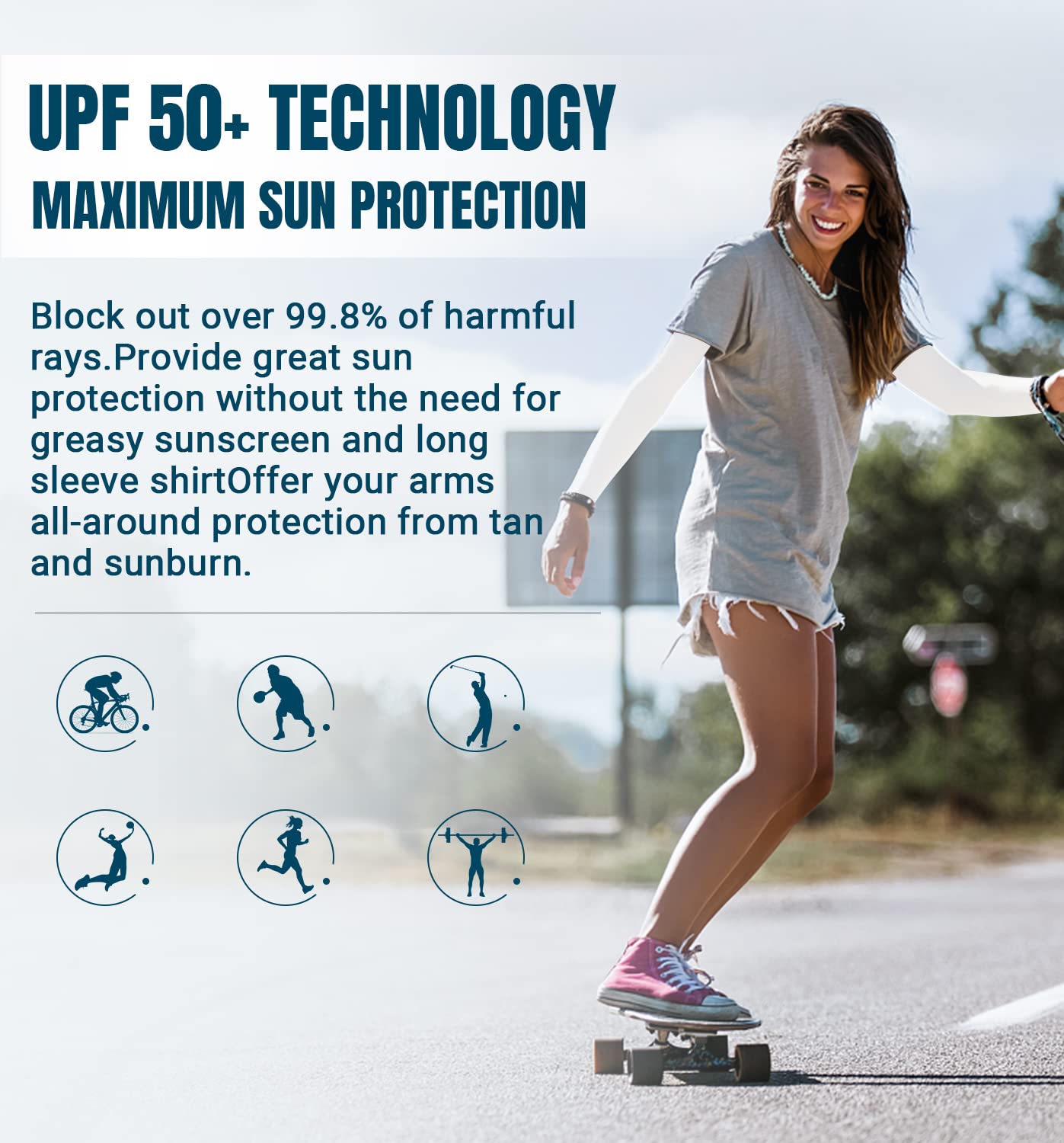 All-Round Sun Protection - UPF 50+ protective technology works great to keep the harmful sun rays off your skin when golfing, shooting, running, bike riding, etc. No need for greasy sunscreen or long sleeves shirts. These uv sun protection arm sleeves shield your arms from sunburn and skin damage during long days in sun.
