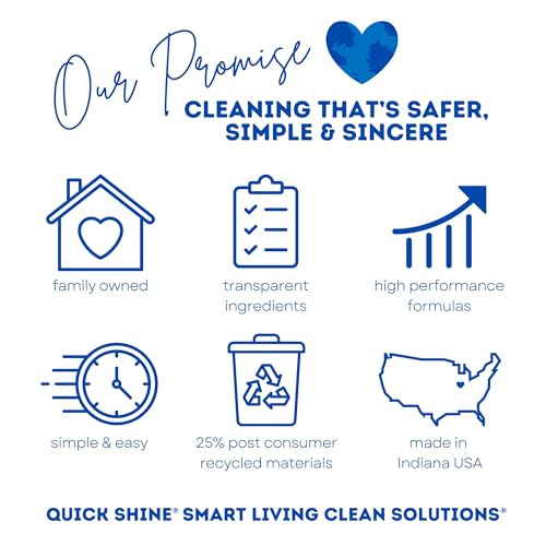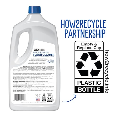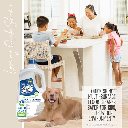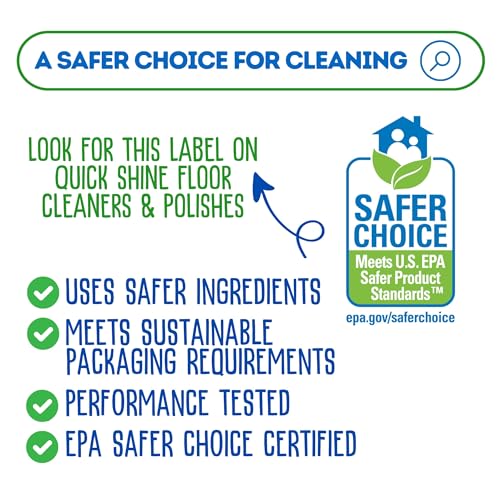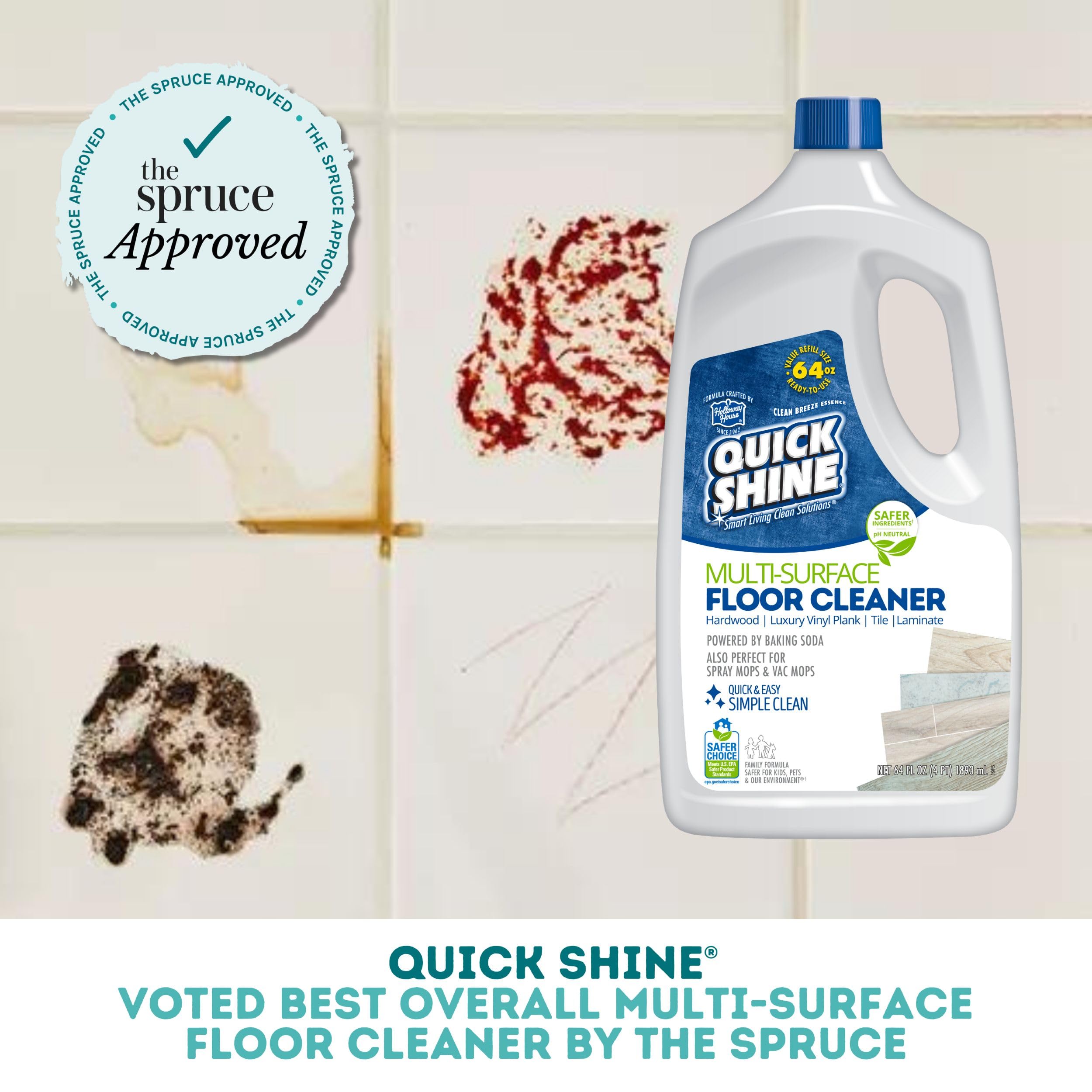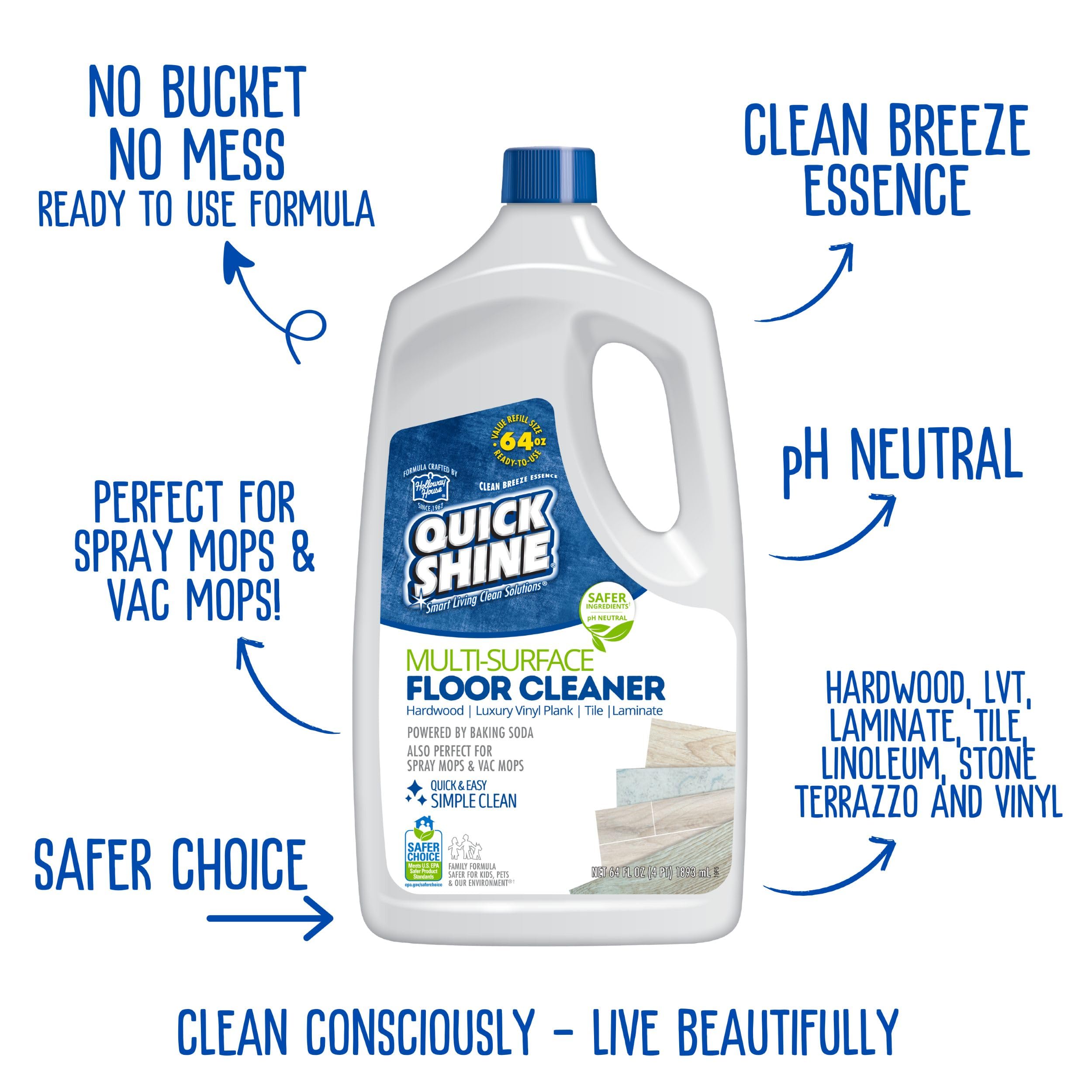 Quick Shine Multi-Surface floor cleaner naturally cleans dirt, grease & scuff marks without harsh alkalis or ammonia. The Quick Shine Floor cleaner leaves no haze, streaking or sticky film. Quick Shine products Are safe to use in homes With kids and pets and meets U. S. Epa safer product standards. This cleaner can be used in our new Quick Shine Spray mop as well as other spray mops and will not clog. And just like all other Quick Shine products, The Multi-Surface floor cleaner is made in the USA.