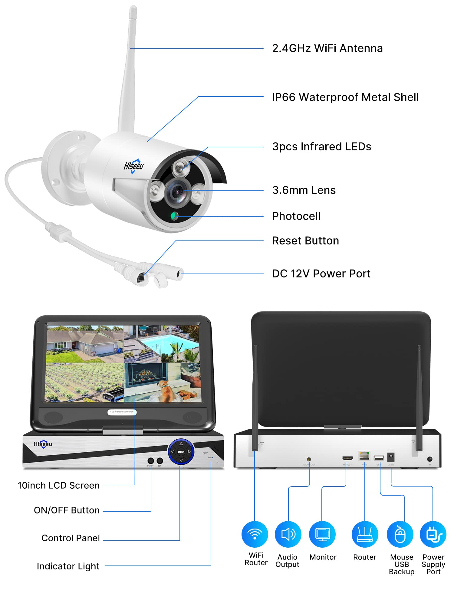 【Expandable 10 Channel Cameras】Please search: B0D6RJZ1ZY to order the extra camera to add to your camera system, This system includes 1x 10-channel 8MP 10.1" LCD Monitor NVR and 4 x 5mp (2592×1944) wireless IP66 waterproof cameras. Connect the NVR and cameras with power adapter, cameras coming with 10ft cable power supply, it is more convenient to install.
