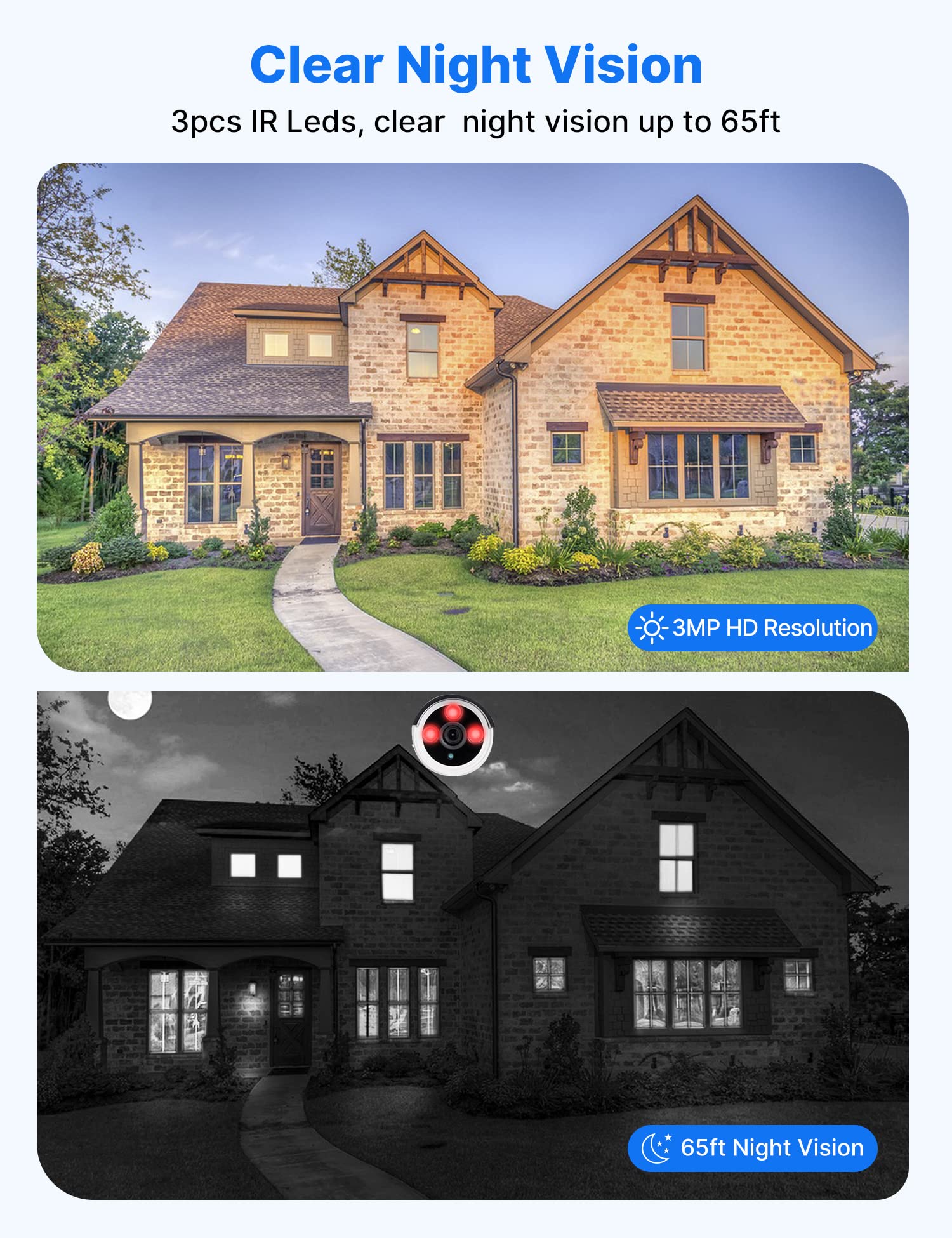 【Waterproof& HD Video】Records in 1944P Full HD to capture sharp and crisp images, provide crystal-clear HD live video, in order to crisp smooth footage day and night the bullet cameras build in 3 array IR cut filter with auto switch. Up to 15m Night Vision, The IP 66 weatherproof aluminum housing material to keep Indoors & Outdoors recording.
