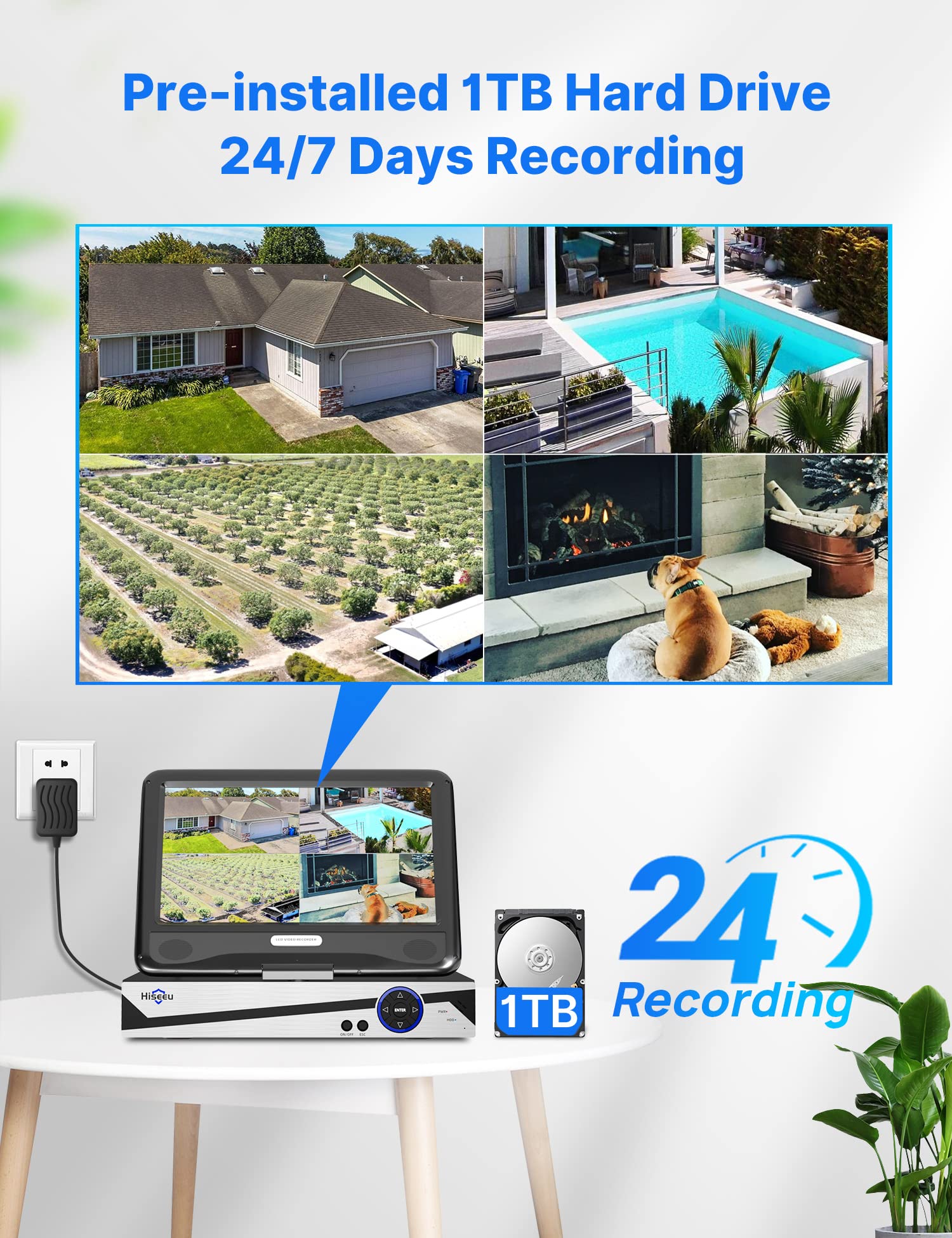 【1TB & Cloud Storage】Outdoor security camera system is preinstalled 1TB Hard Drive, will store 24/7 days time continuous loop recording, which will loop about 30 days. 7-days free cloud storage for one channel camera, each channel need buy cloud storage one by one