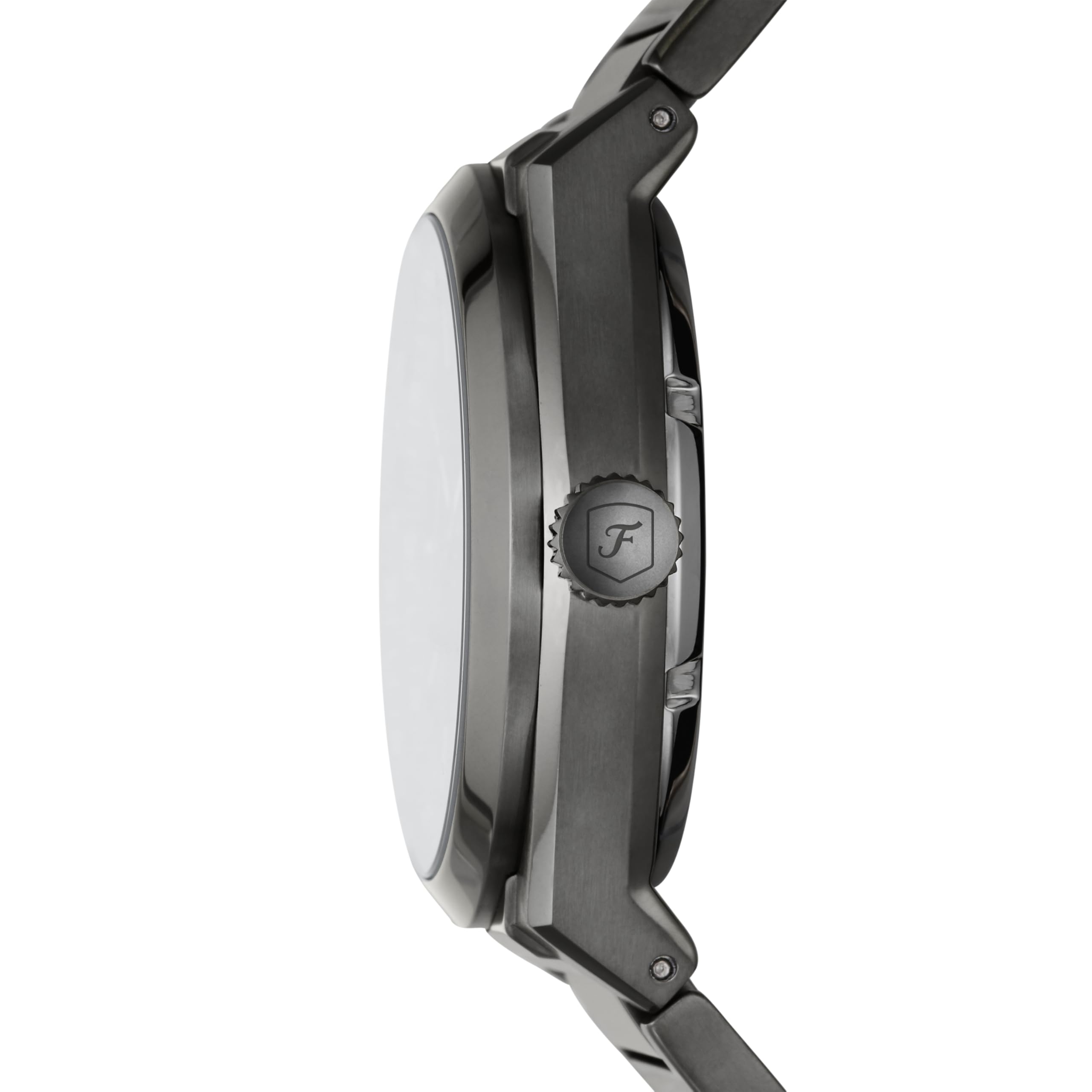 WRIST WATCH BAND: Smoke gray, durable stainless steel bracelet band with a secure fold-over clasp closure; links can be removed for a customized fit of this analog watch