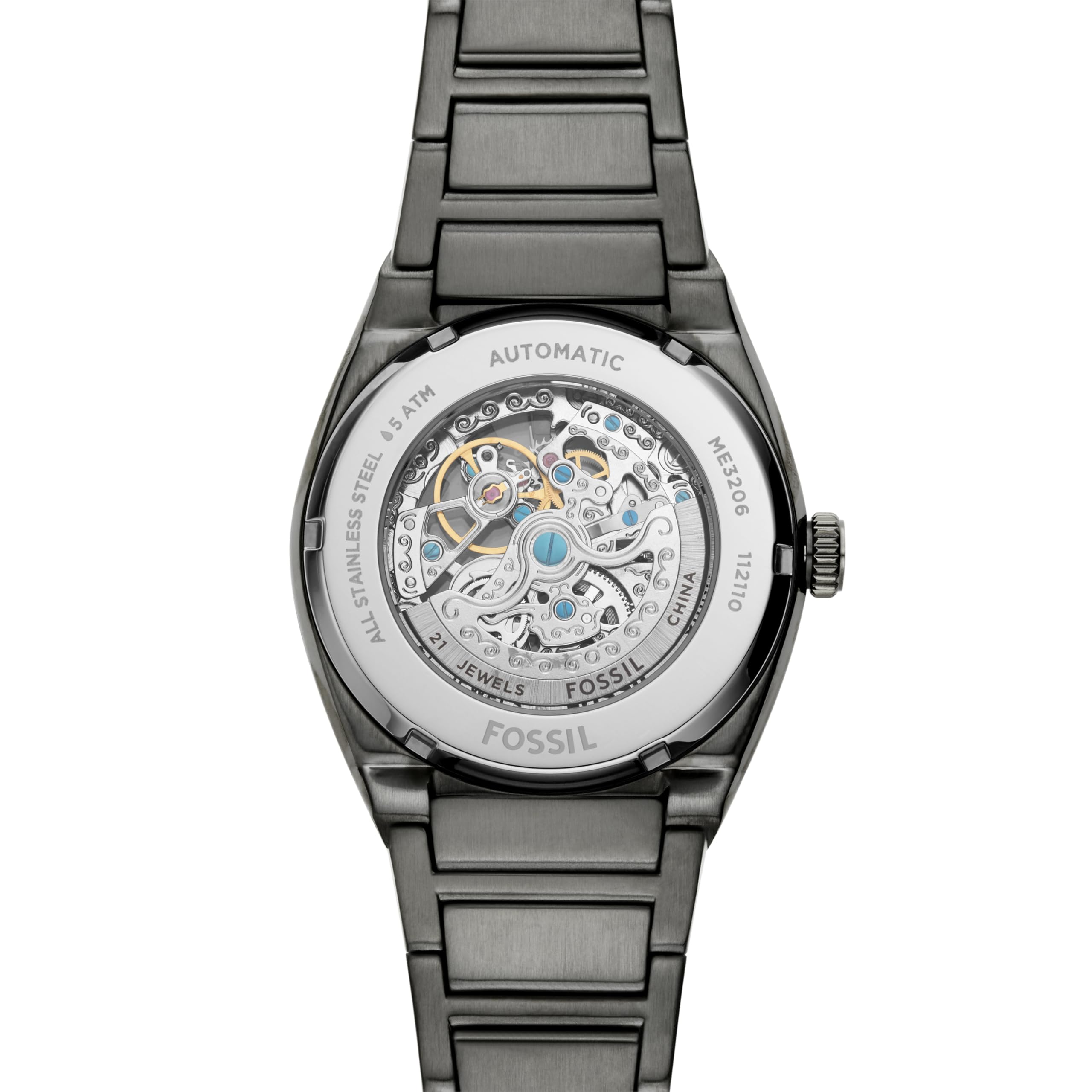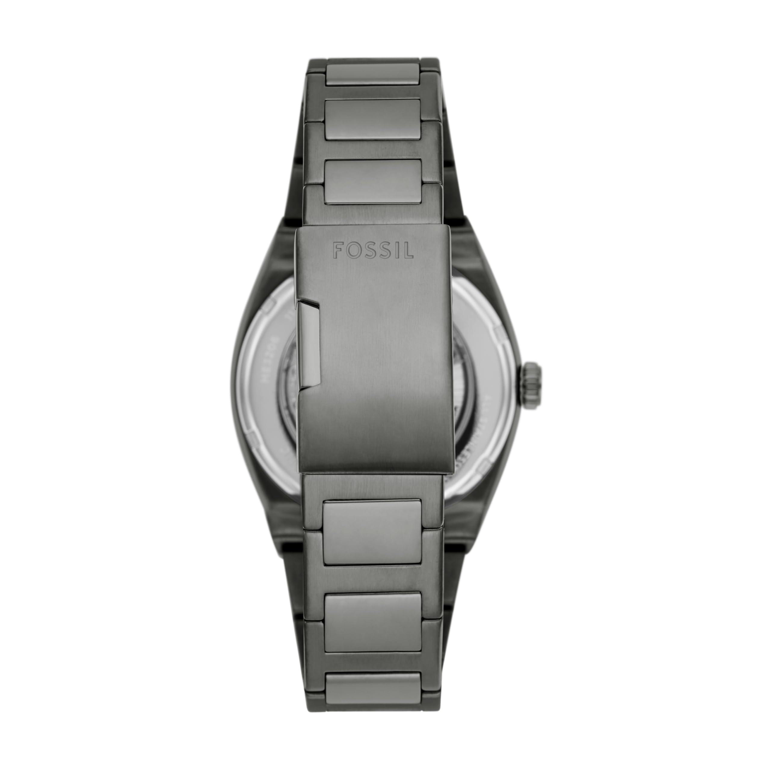 DIAL: A Fossil watch with a round smoke gray stainless steel case, a gray skeleton dial and gray accents