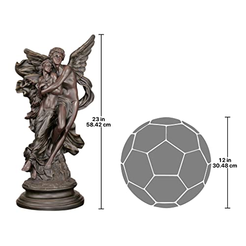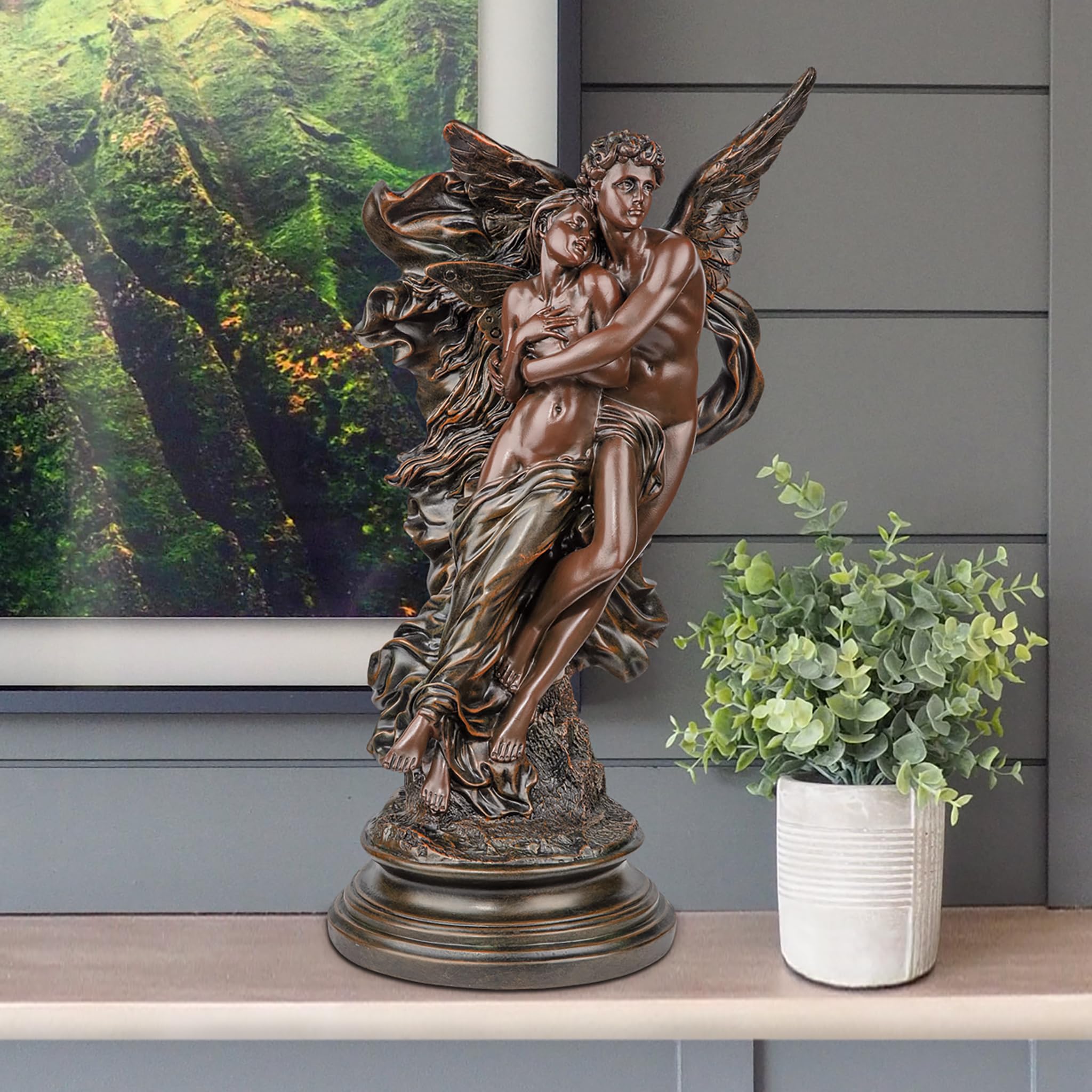 At a dramatic two' Tall, this three-dimensional sculpture depicts the romantic tale of Cupid, God of love, as he rescues his wife Psyche. Its fine detail, from softly draping fabric to muscular human forms, is cast in designer resin & finished in faux Verdigris Bronze to showcase a timeless sculpture celebrating the triumph of love. 12&Frac12; "Wx9½ "Dx23"H. 15 lbs.