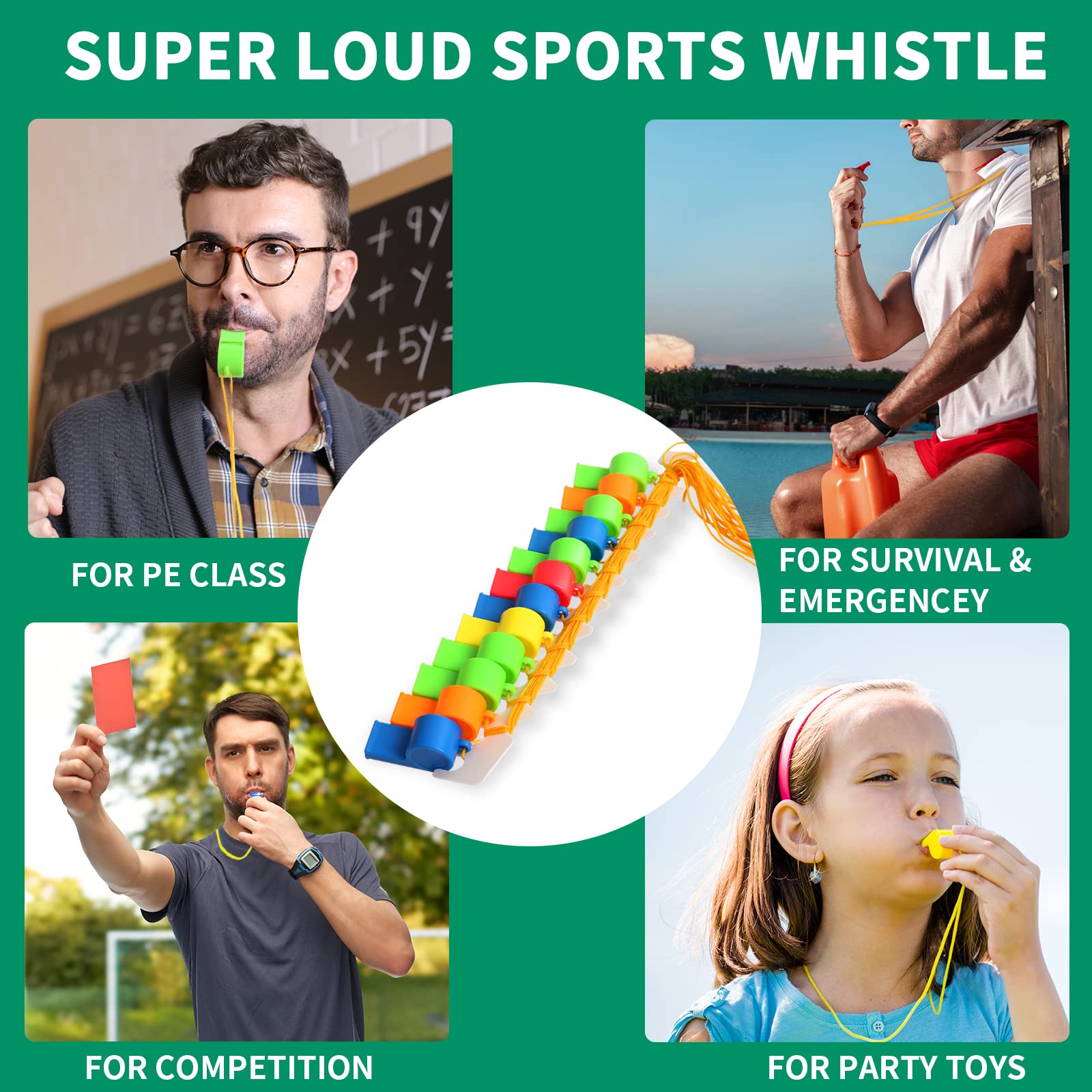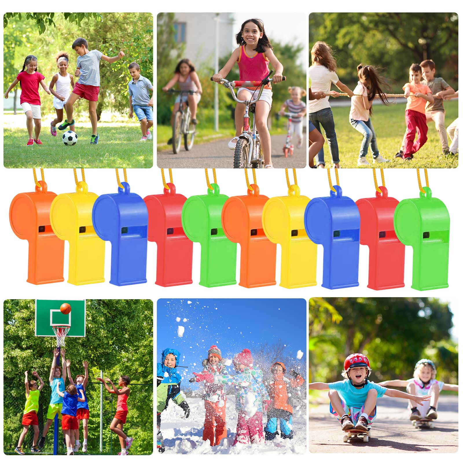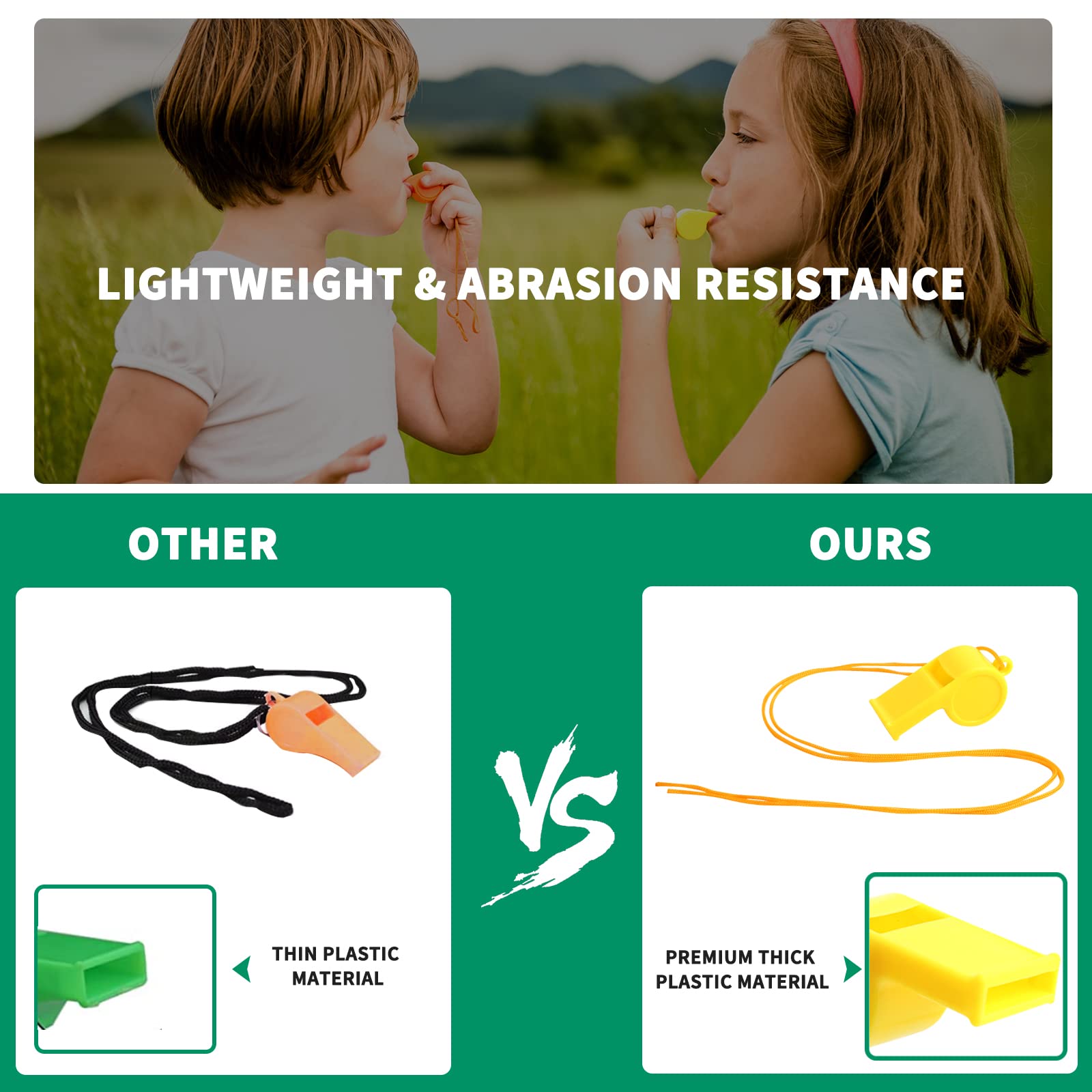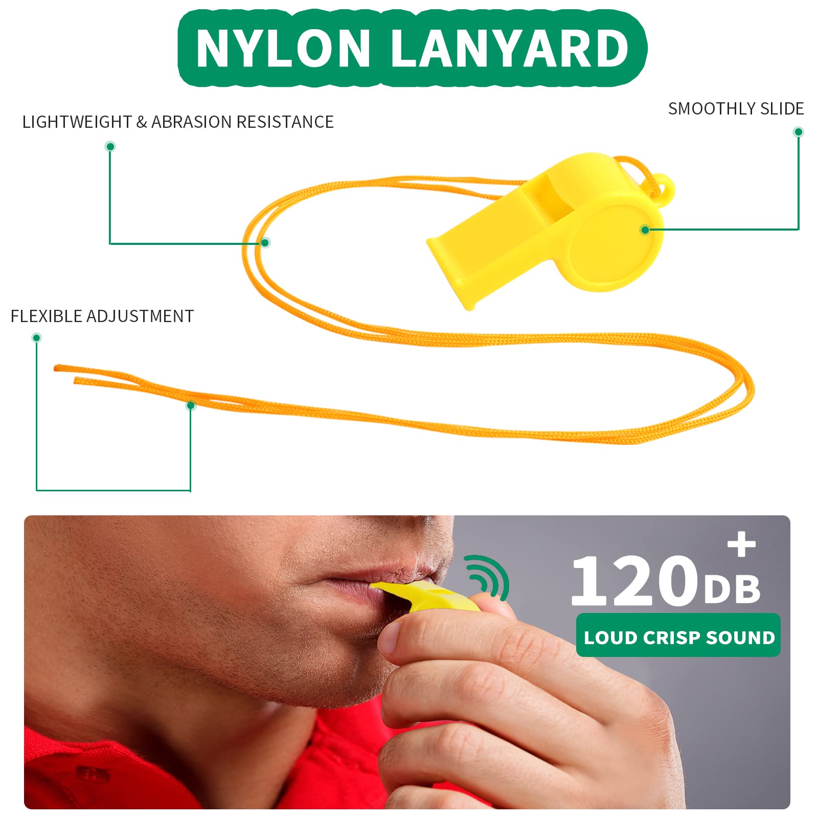 48Pcs plastic whistles: Package included 48pcs sports whistle with tied lanyard