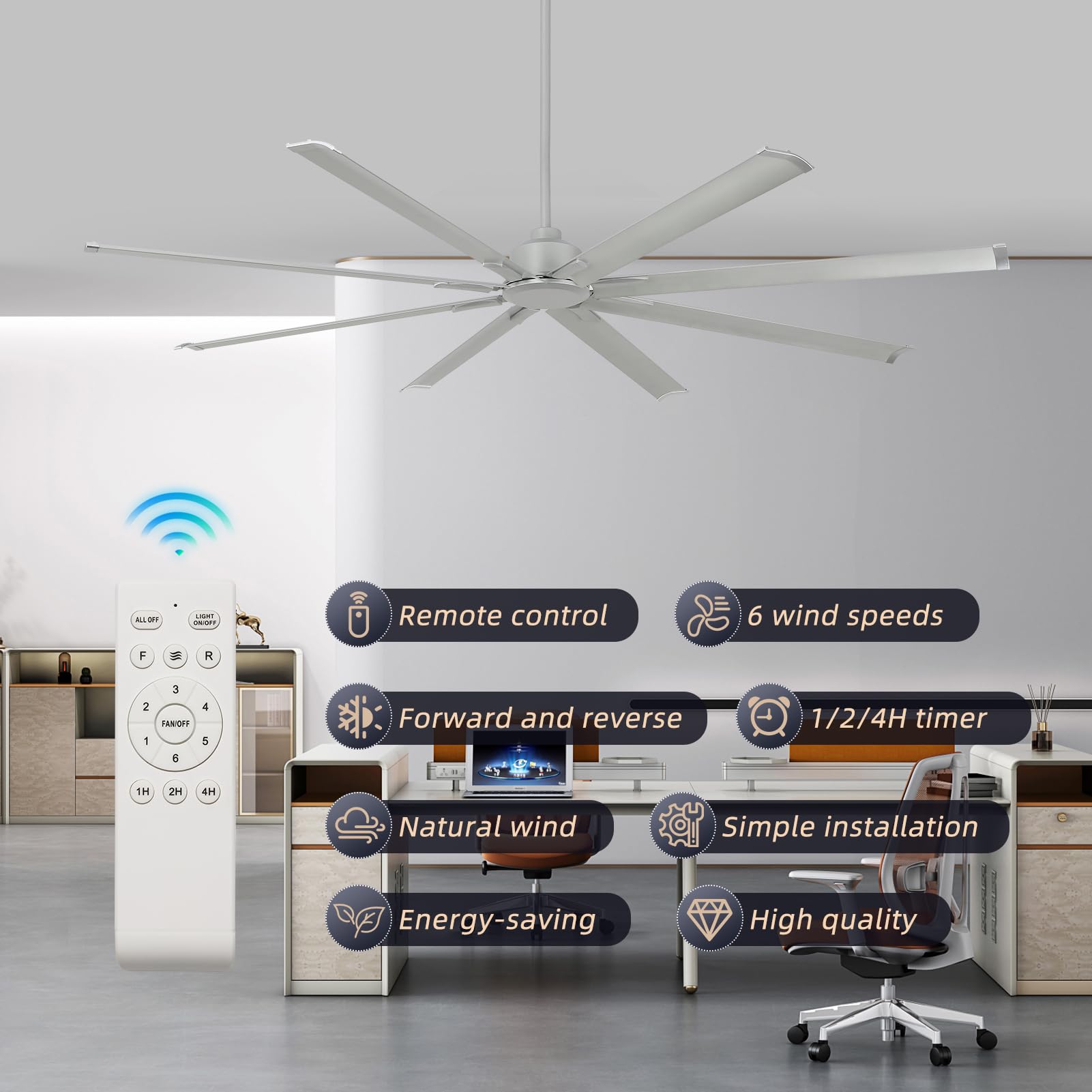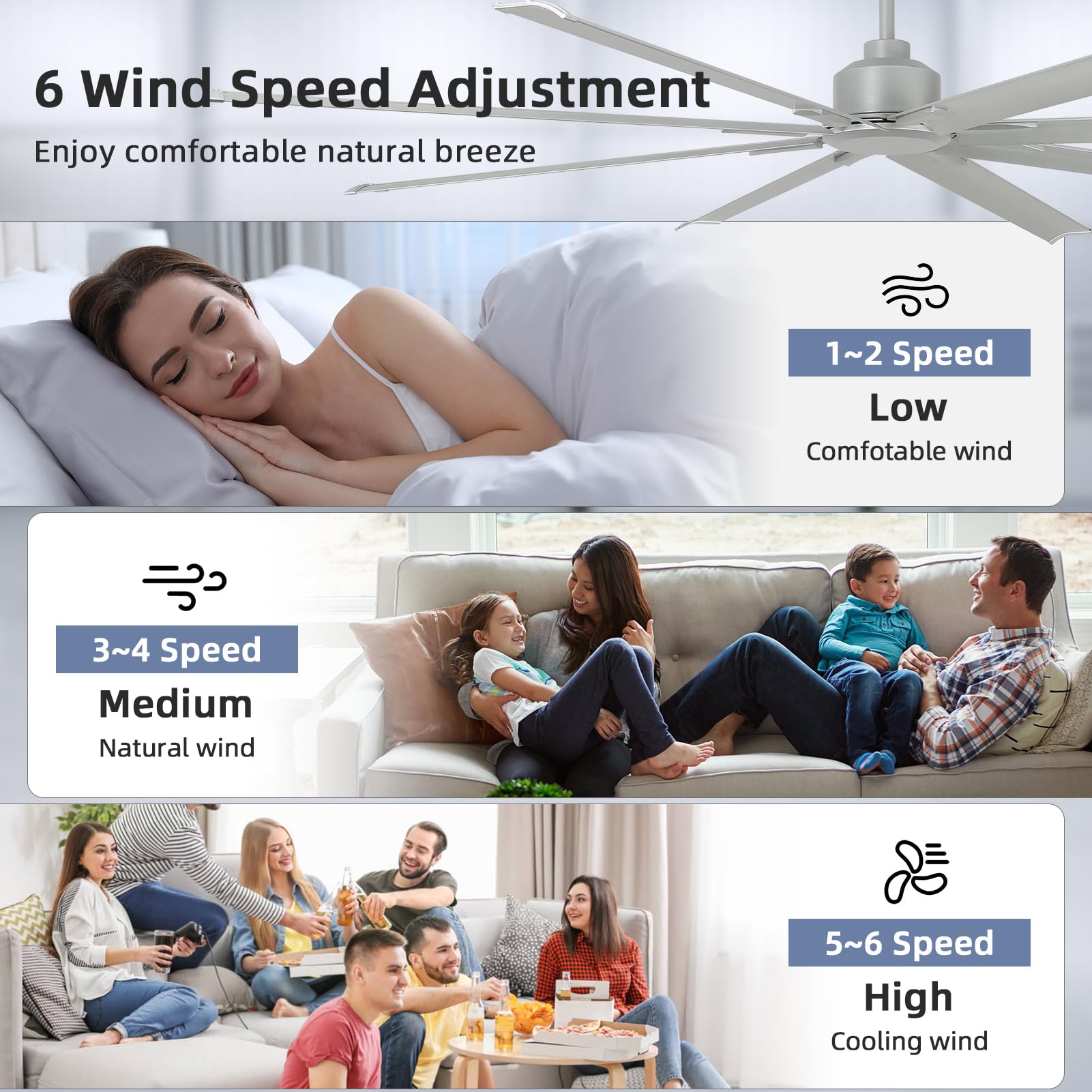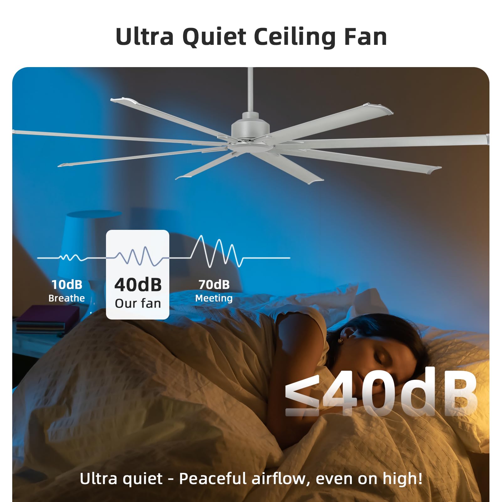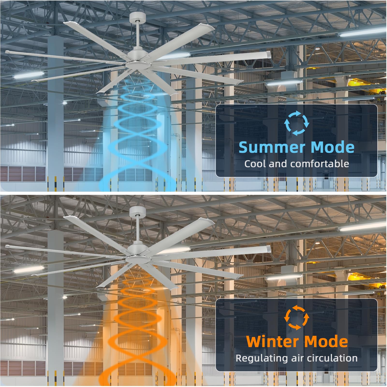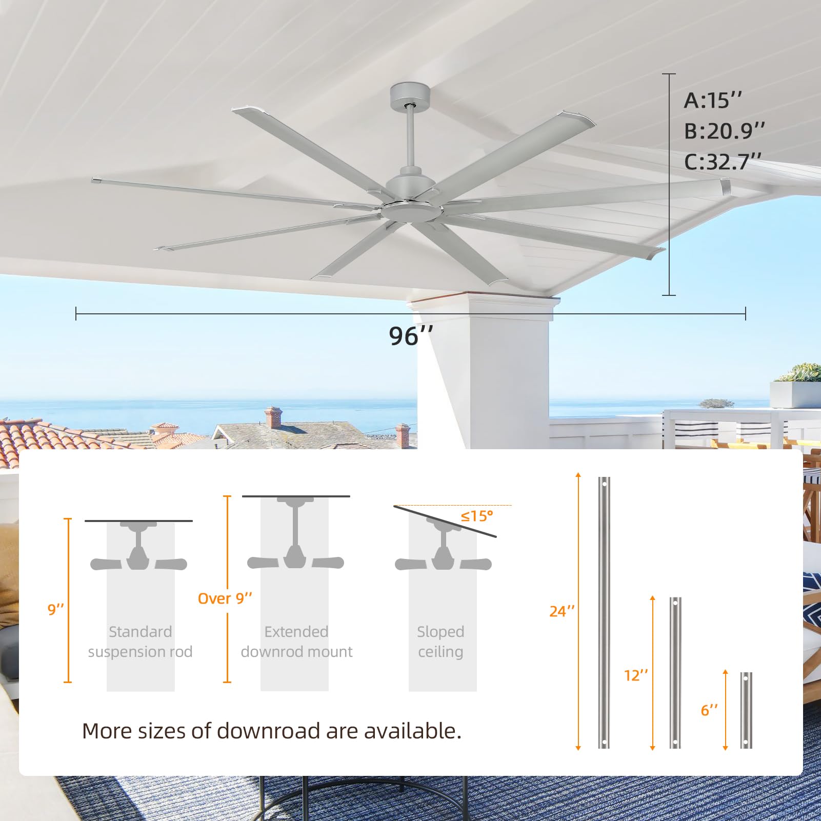 【Large Ceiling Fan with Aluminum Blades】: Our extra large ceiling fan with 8 unbendable Aluminum Blades features sturdy, reinforced 96-inch aluminum blades that maintain stable airflow under any conditions, providing optimal cooling and ventilation for large spaces