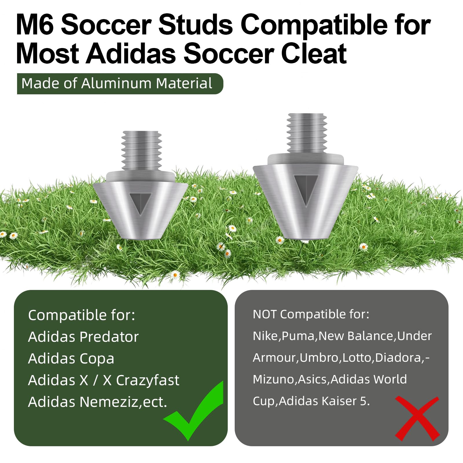 Superior M6 Cleat Compatibility: Designed exclusively for Adidas soccer cleats with M6 thread, including popular models like Adidas X, Predator SG, Nemeziz, and Copa. NOT compatible with Nike, Puma, or other brands. Please verify your cleats have the M6 thread before ordering to ensure a secure fit