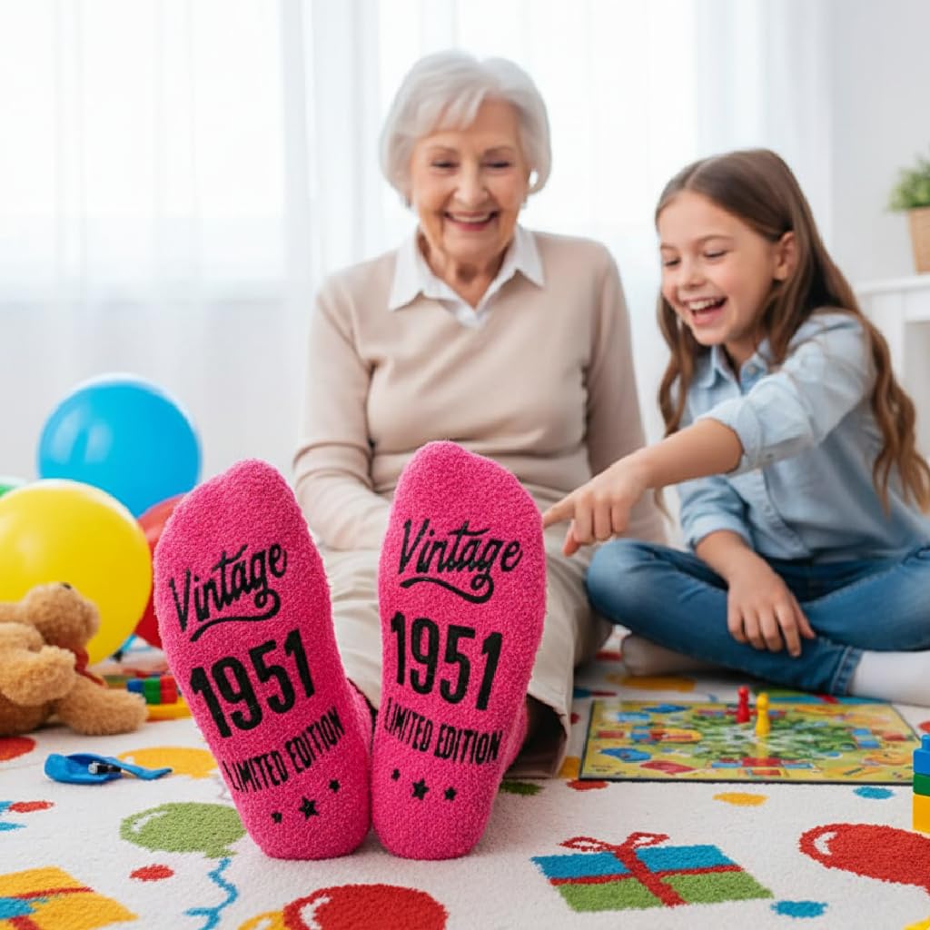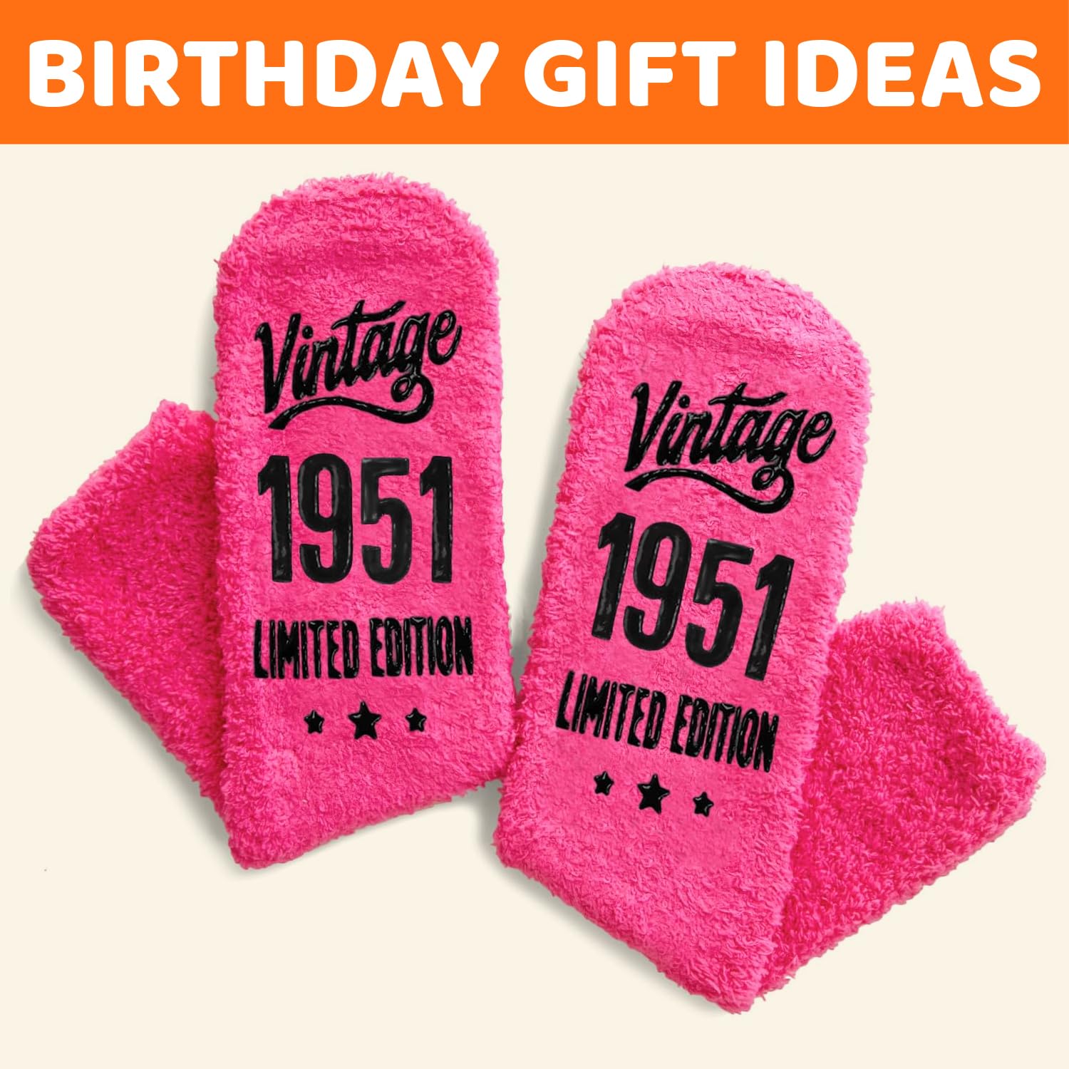 1951 BIRTHDAY GIFTS: Give her this perfect 75th birthday gift to remind her of joy. Her smile will widen when she reads "Vintage 1951 LIMITED EDITION"—practical, emotional, humorous socks for friends or family born in 1951!