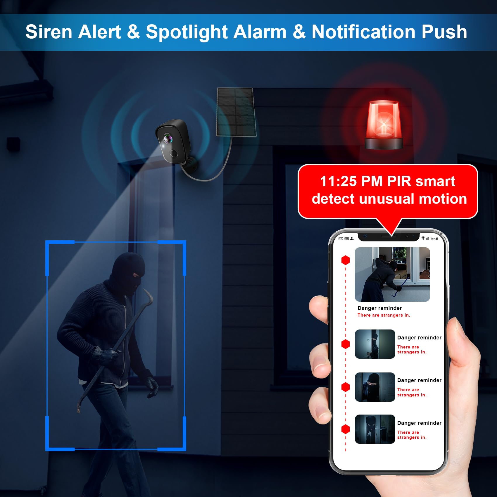 TWO-WAY TALK, SMART INSTANT SIREN: This outside camera has a built-in microphone and speaker that supports real-time, two-way, audio calls. With the mobile App you can warn off thieves, screen visitors at your door or communicate directly with your family or friends. Siren, flashing white light or 2-way talk that both allow you to drive away thieves and unwanted visitors.