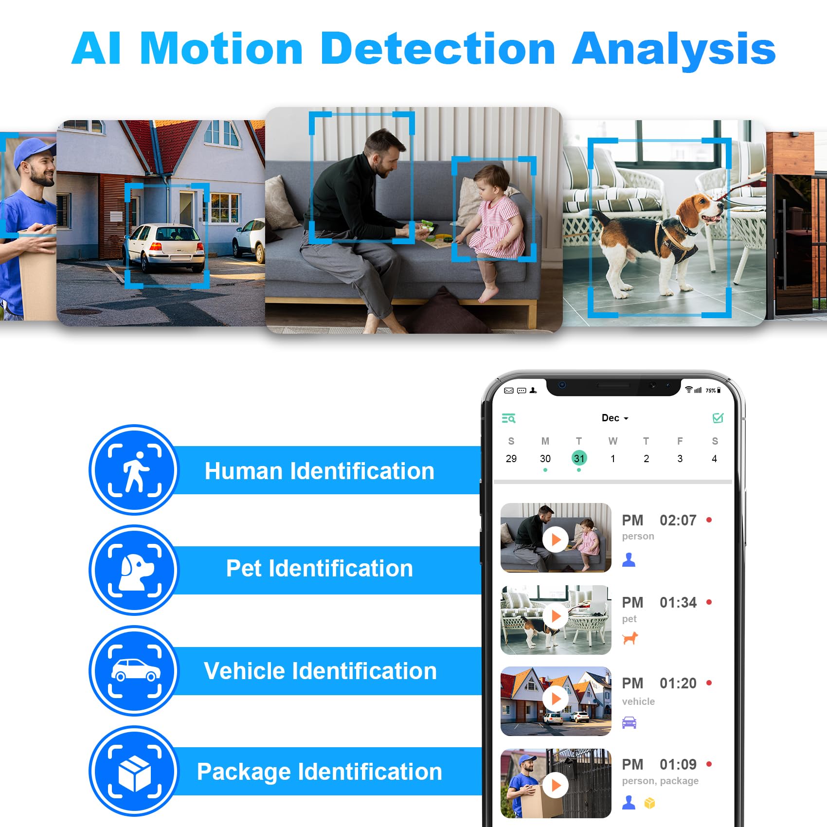 PIR MOTION DETECTION WITH AI ANALYSIS RECOGNITION: This outdoor camera wireless with advanced smart AI motions detection, it can clear analysis and recognition person, vehicle, pet and package. The AI PIR sensor will be triggered in real time once the outdoor security cameras detect motion, at the same time, the notification will be pushed to your phone via the app. And this security camera can be shared with multiple users.