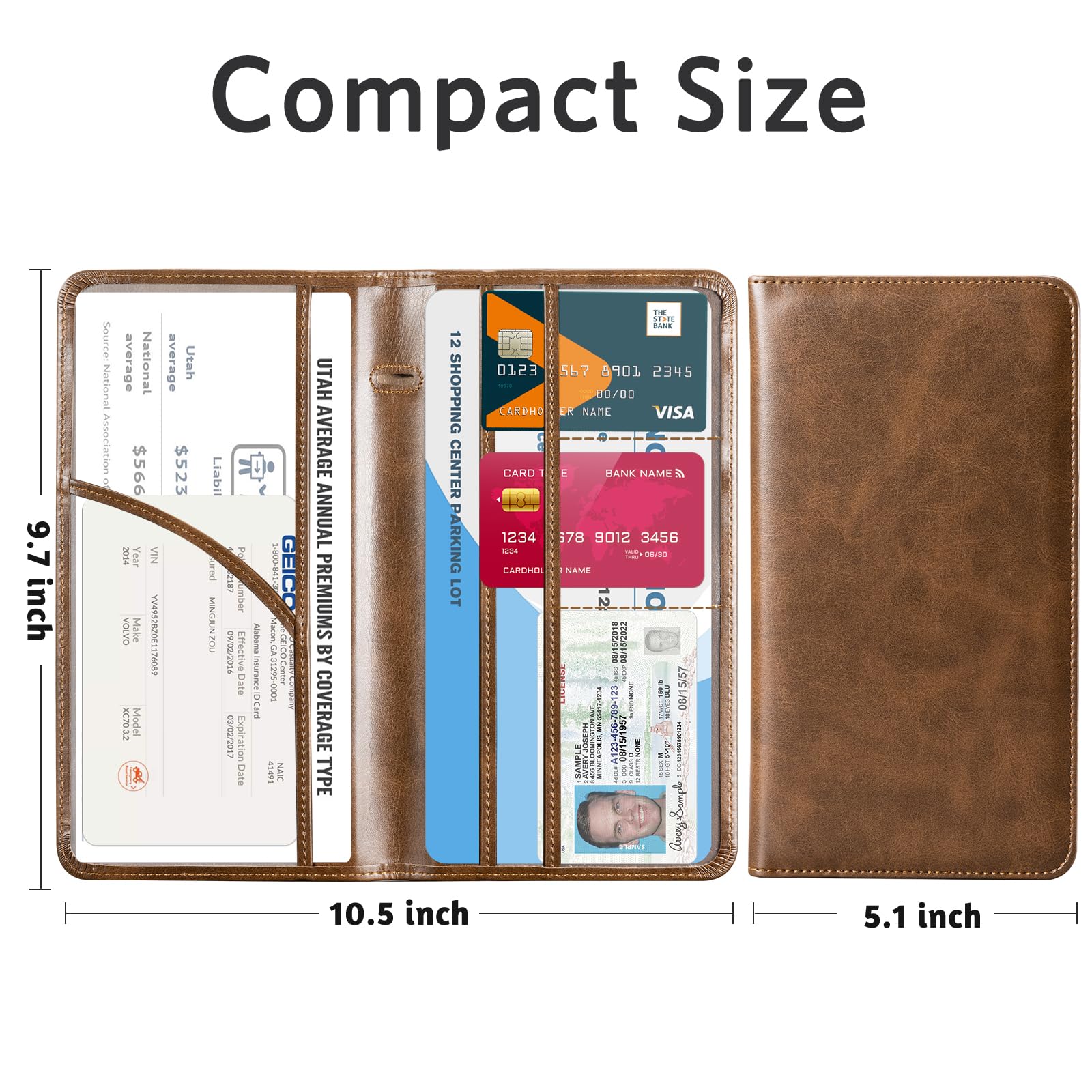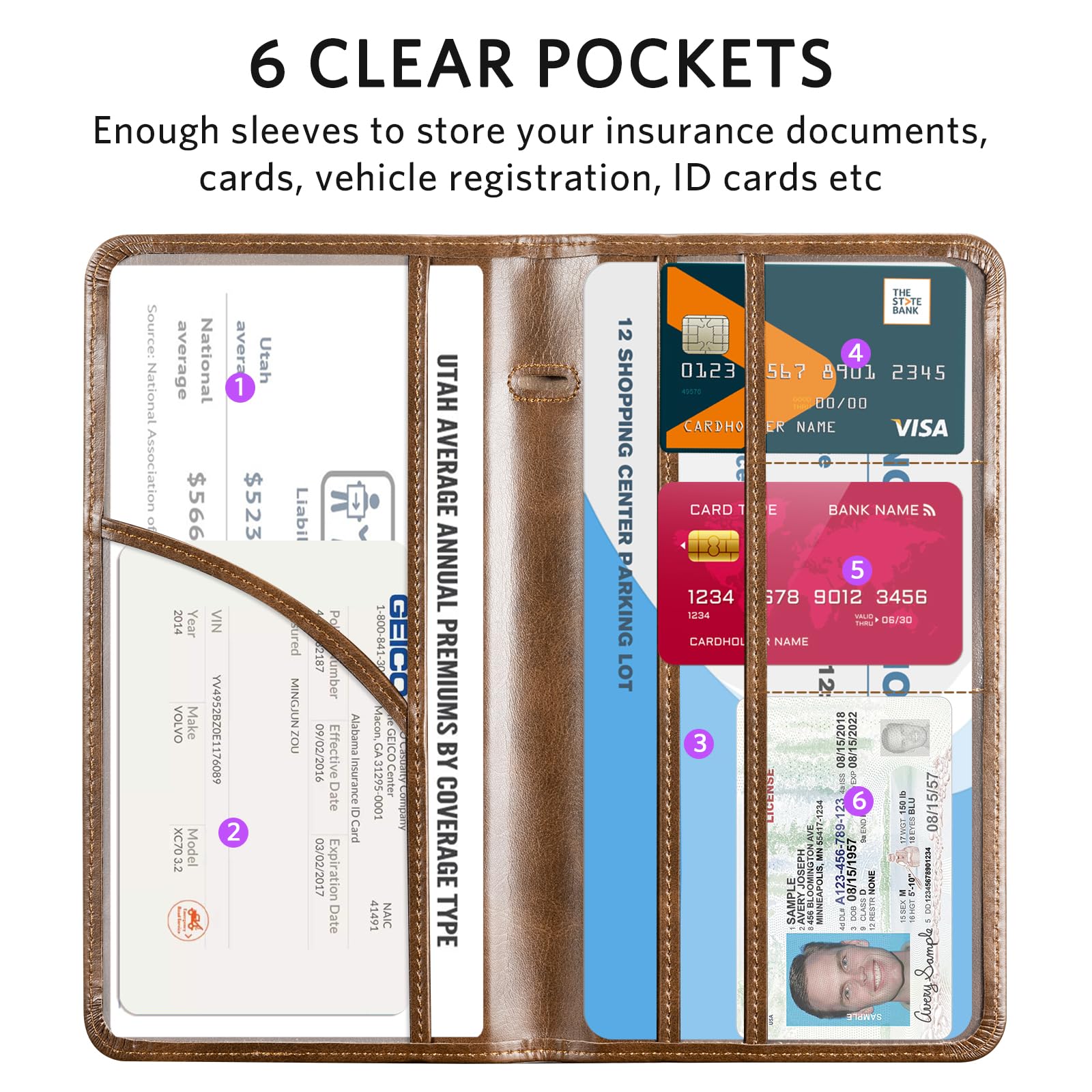 6 COMPARMENTS: Comes with 3 large pockets for insurance documents, vehicle registrations cards and other valueable information. And 3 small pocket for driver's license, ID cards, business cards, key contact information cards.