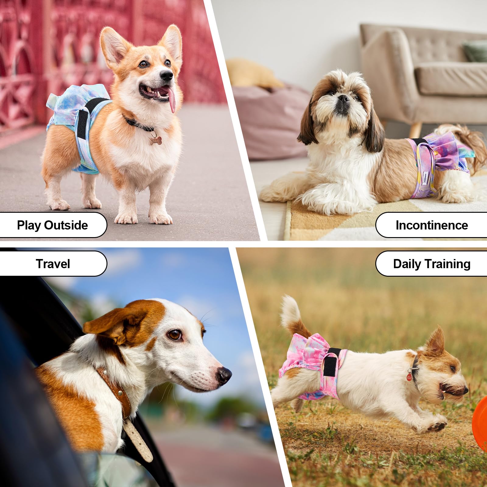 Convenient and Comfortable: The reusable puppy diapers for females integrate with the skirt and are designed to combine practicality with beauty. With the flexible ring Velcro and waist elastic, not only can the size of the female dog's diaper be freely adjusted according to the dog's waist, but it is also quick and easy to put on and take off without sticking to the pet's fur. There is a hole on the back of the dog's diaper to release the tail, which effectively increases the dog's comfort.