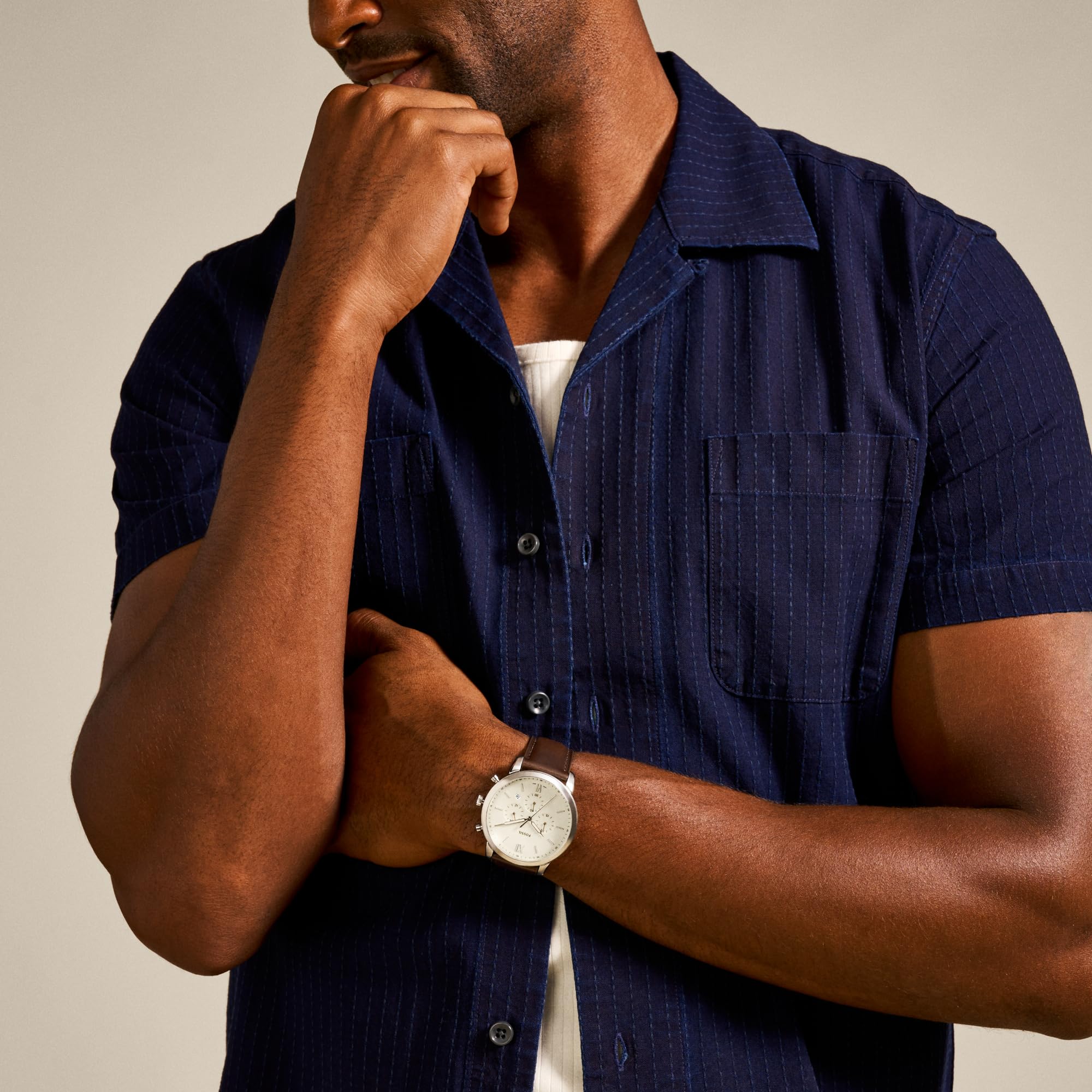 BIG FACE STYLE: This 44mm Neutra features a cream satin dial with Roman numeral and stick indices, chronograph movement and a brown leather strap. This big face watch for men is inspired by mid-century architecture with its proportions and symmetry