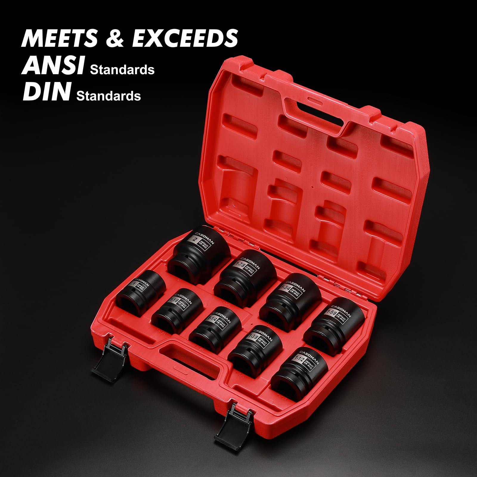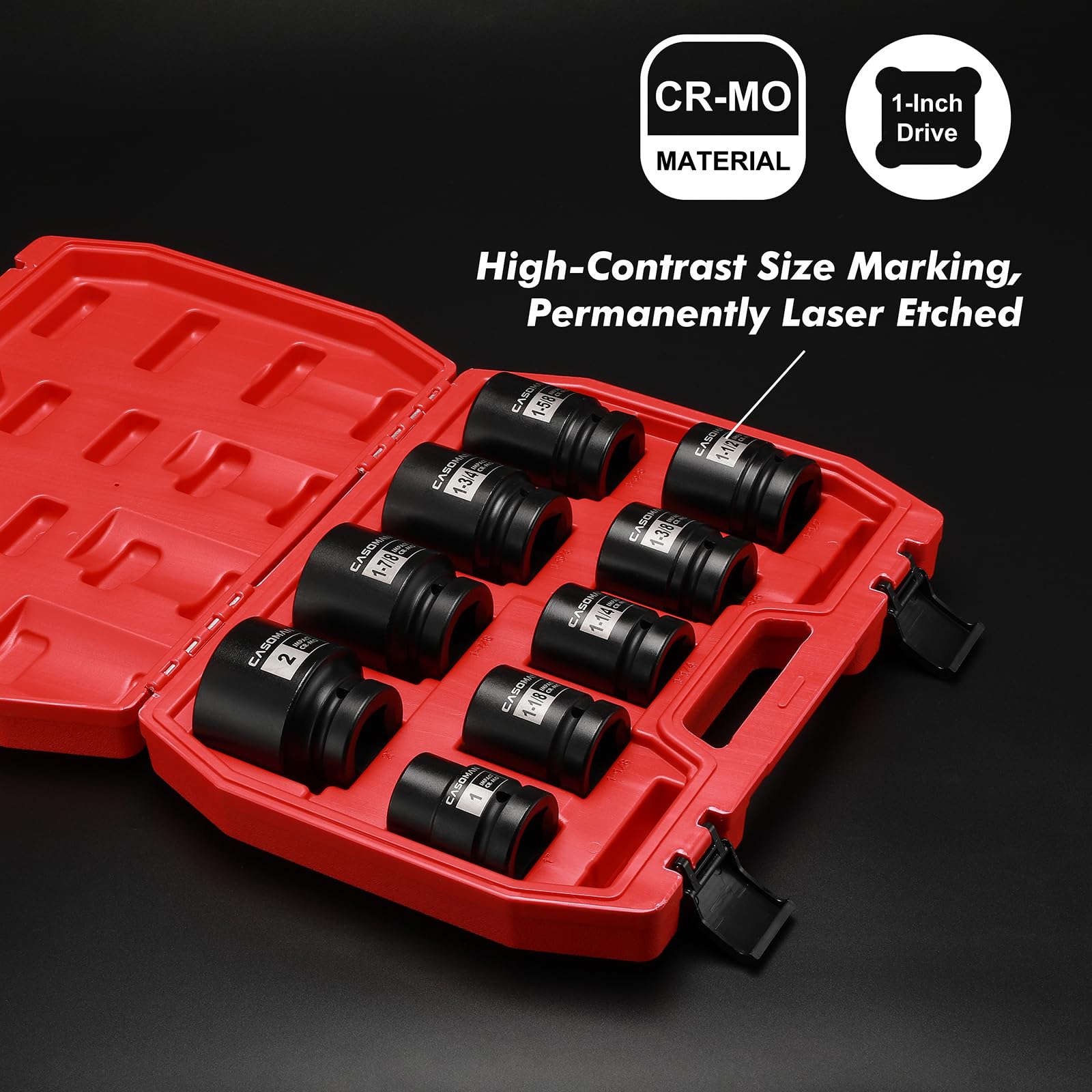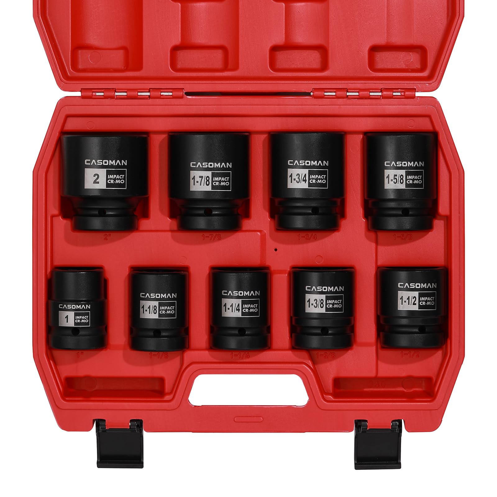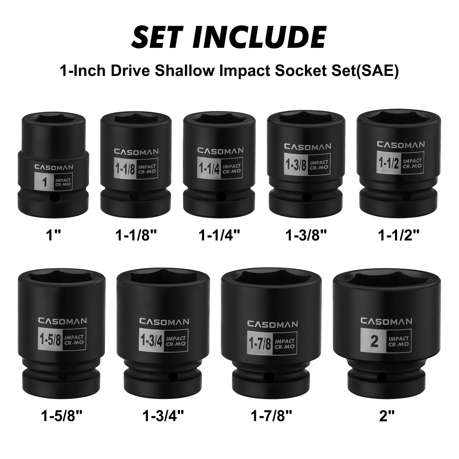 Set include: 9Piece 6 Point 1-Inch Drive Impact Shallow Socket Set: 1", 1-1/8", 1-1/4", 1-3/8", 1-1/2", 1-5/8", 1-3/4", 1-7/8", 2"