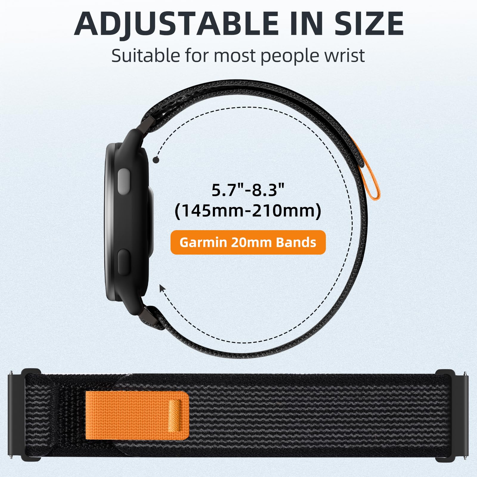 【Adjustable at Will】IMIVIO nylon loop bands are compatible with Garmin 20mm watches. The adjustable hook-and-loop fastener allows you to customize the band size freely. Easily fits wrists from 5.7" to 8.3" (145mm - 210mm), ensuring consistent skin contact for more accurate sensor readings during any activity—all while staying comfortably secure