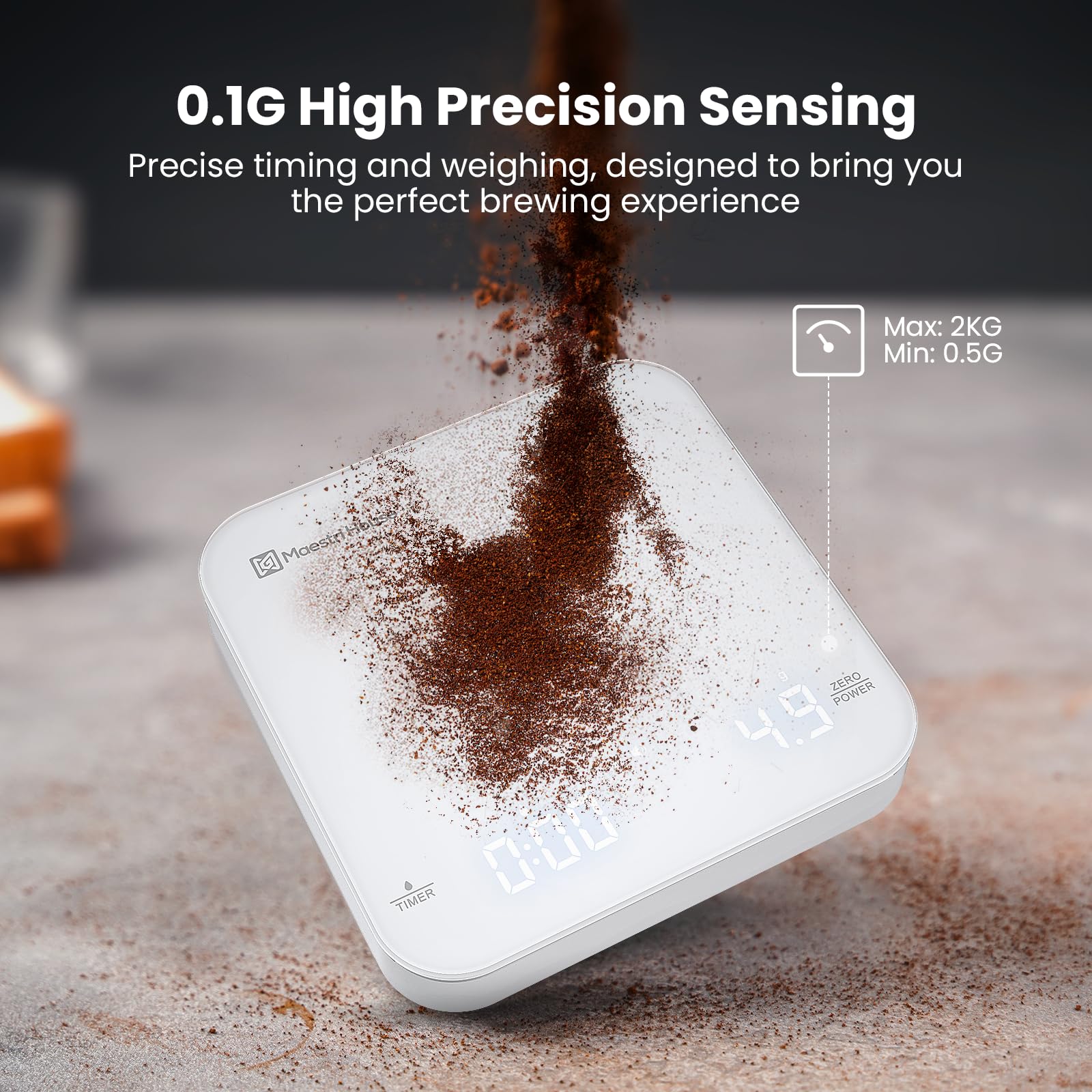 【Elegant Design & Premium Materials】Maestri House Digital Coffee Scale features a sleek, minimalist design with borosilicate glass surface. It adds elegance to your kitchen, seamlessly blending with your decor. With a hidden LED display and touch-sensitive controls, its seamless surface enhances aesthetics and ensures waterproof, easy cleaning. It includes a detachable silicone pad for surface protection, offering waterproof, slip-resistant, scratch-resistant, and heat-insulating properties