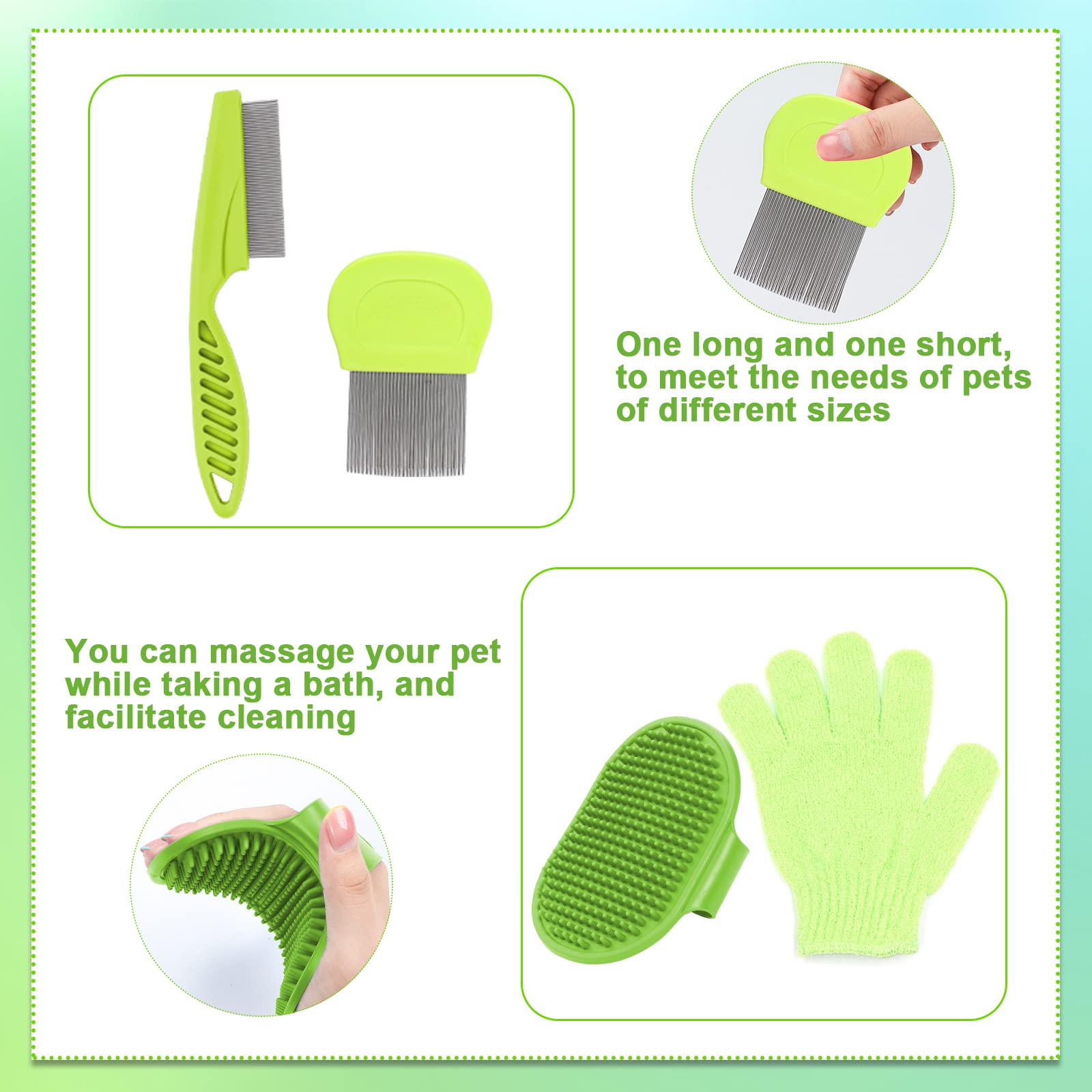 【8 Pieces Pet Grooming Kit】 The set contains pet nail clipper and file, flea comb*2, pet shampoo bath brush , pet shedding slicker brush, bath massage glove, small cleaning comb.