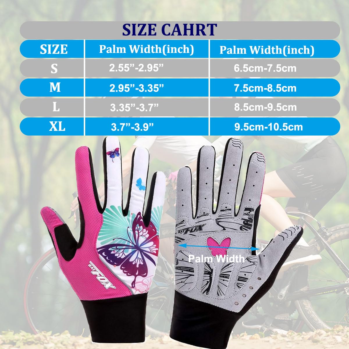 【UNIQUE WRIST DESIGN】---Elastic Hook and Loop strap around the wrist makes it easy to put on and take off.Terry cloth design on thumbs makes it easy to wipe away dripping sweat and keep your eyes on the road. Size(Palm Width):S:2.55"-2.95",M:2.95"-3.35'",L:3.35"-3.7".