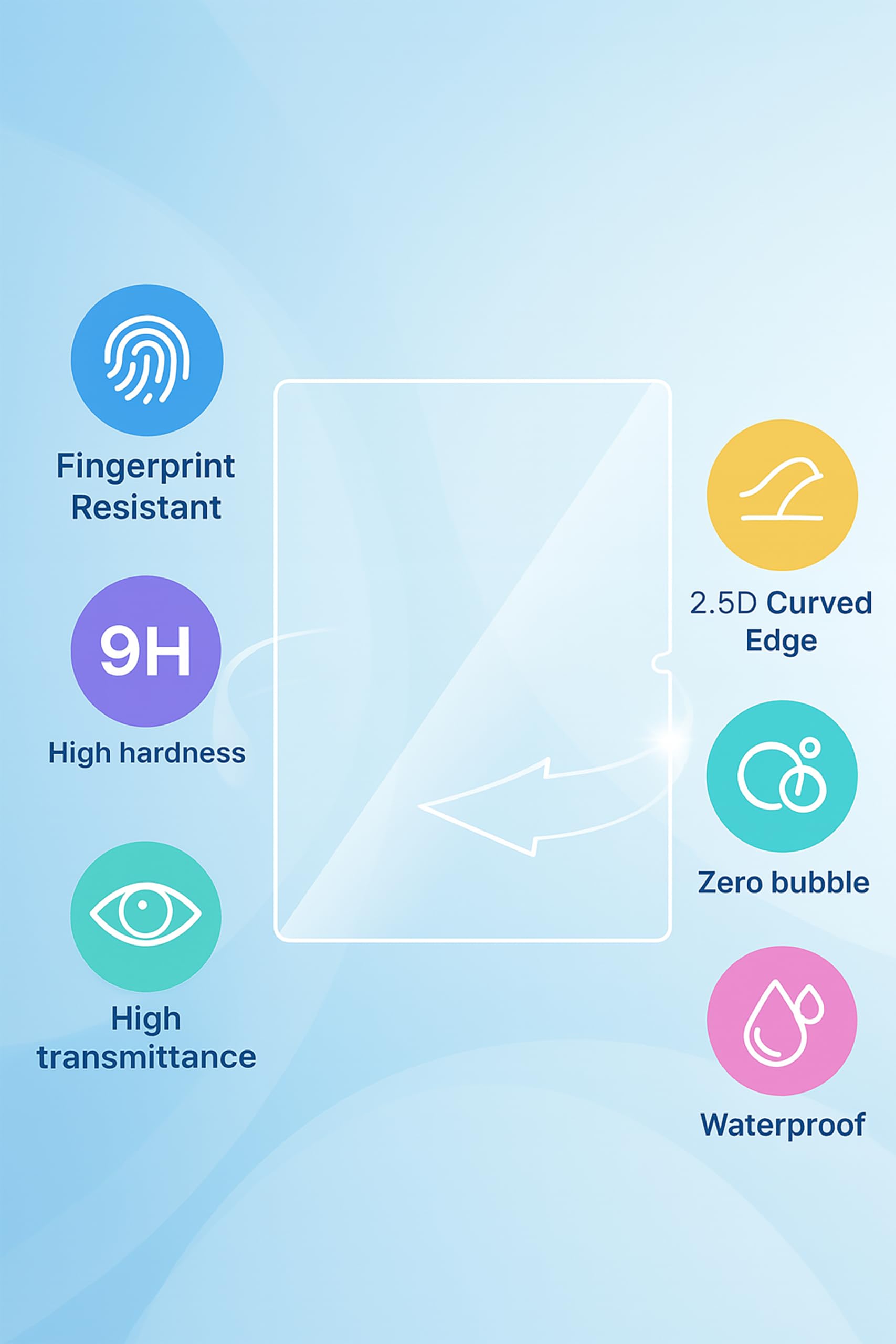 9H hardness surface with Super 99.99% HD transparency,True touch sensitivity; Ultra thin (0.33mm thickness); 2.5D Rounded edge integration