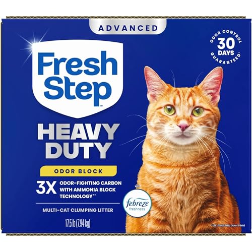 Keep your home fresh and your cat happy with Fresh Step Advanced Heavy Duty Clumping Litter. Powered by Febreze and black carbon odor shield granules, this clumping cat litter has 3X odor-eliminating carbon (1) and neutralizes odors as soon as they occur, keeping litter boxes fresh and clean. Enjoy 30 days of guaranteed odor control (2) with this Fresh Step litter—Fresh Step's longest odor-fighting formula yet (3). This Fresh Step Heavy Duty Cat Litter also has naturally-strong clay plus built in odor defense and ClumpLock technology that forms tight, easy-to-scoop clumps around liquid and cat urine. This makes cleaning the litter box a simple, hassle-free process. Plus, the low-dust formula helps keep your floors and kitty litter box area cleaner. Enjoy more catnaps and cuddle time with your kitty when you choose Fresh Step cat litter. (1) vs. Fresh Step Multi-Cat (2) See package for more information on terms and conditions (3) Among Fresh Step clumping litters