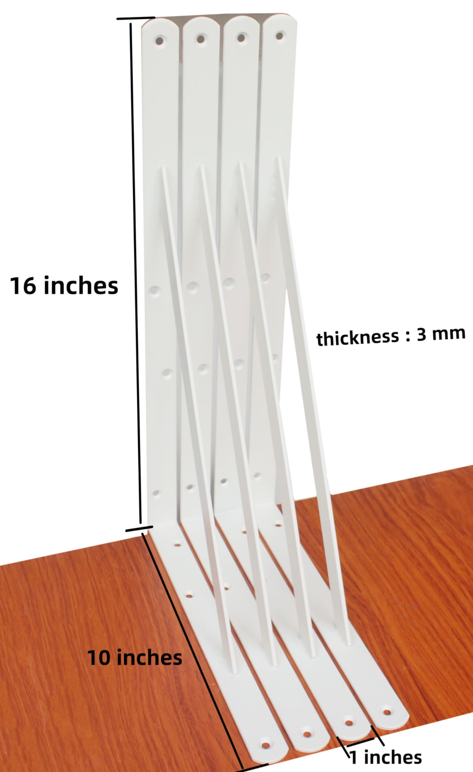Size:L 16" x H 10" x W 1", 3mm Thick. Package included: 8 x Brackets , 24 x long Screws, 32 x short Screws(Wood plank is Not included)Our floating shelf brackets come with 8 brackets for your wall mounted shelves.Our heavy-duty brackets can support Audio Equipment,bookshelf,kitchen ware,electric power tools , TV bench ,farm tools,etc.