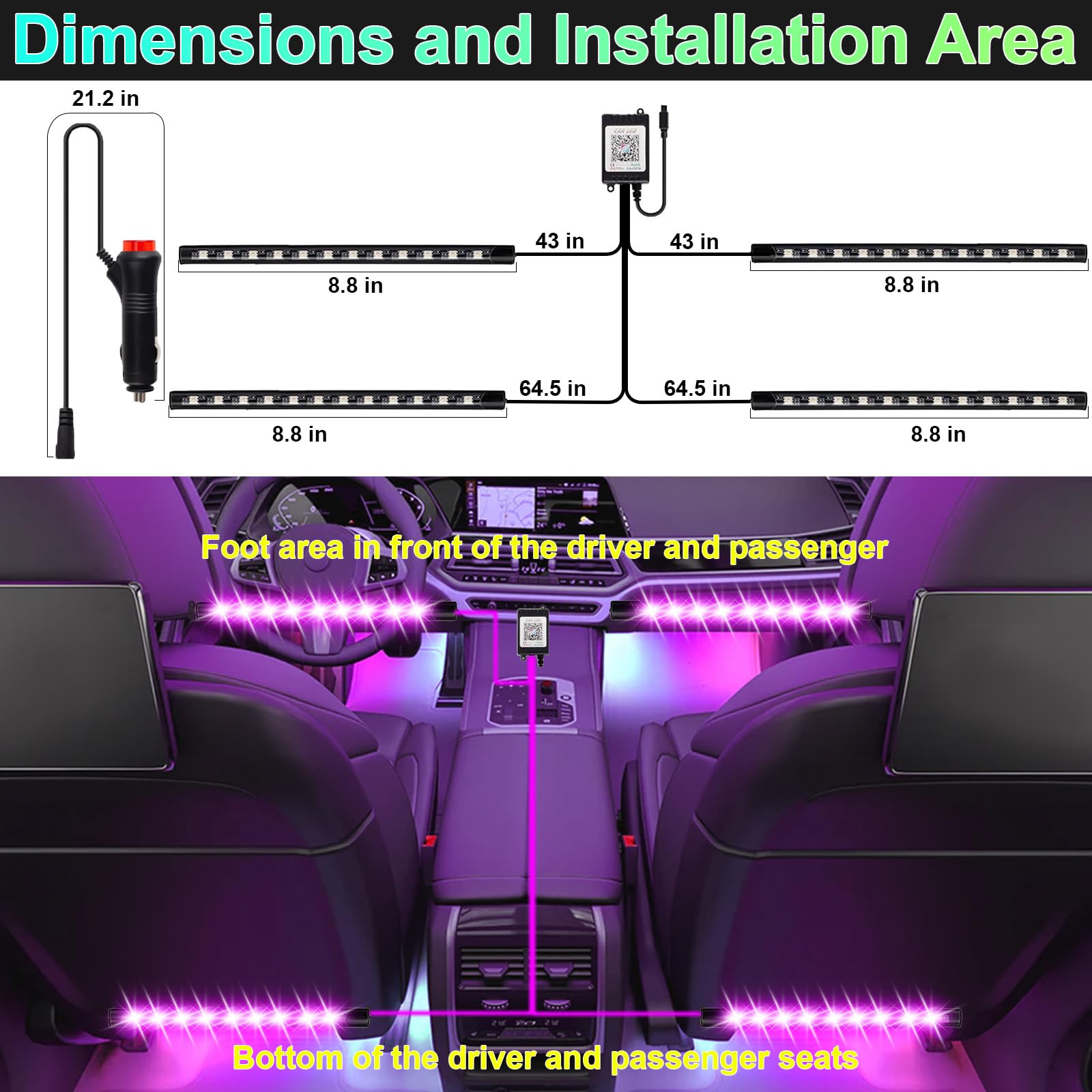Multiple Control Methods:Control the LED interior lights using either the included remote or the Bluetooth app. Adjust the brightness, color, and timing effortlessly, making it easy to enhance your car's interior lighting at any time