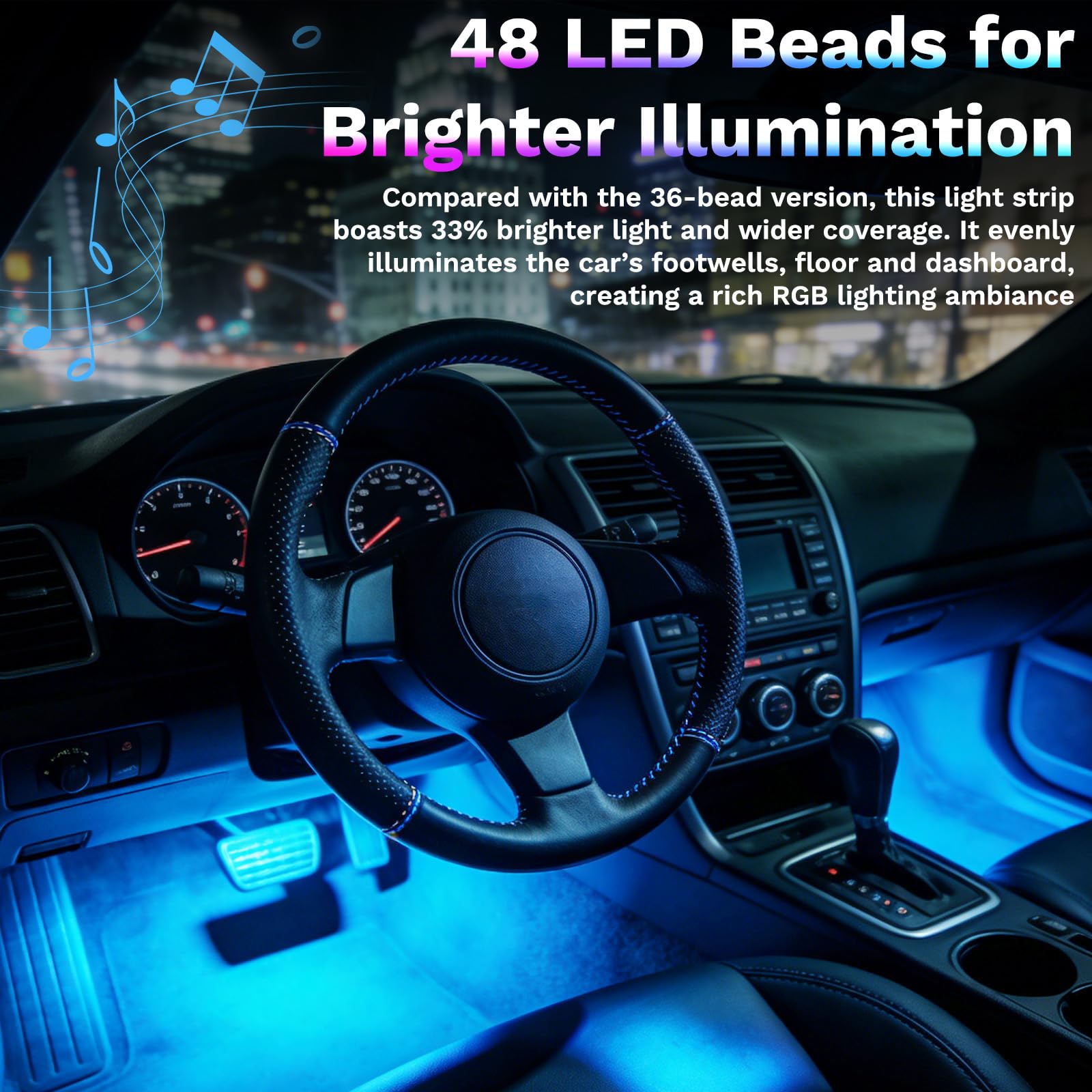 48 LED Beads for Brighter Illumination - Compared with the 36-bead version, this light strip boasts 33% brighter light and wider coverage. It evenly illuminates the car’s footwells, floor and dashboard, creating a rich RGB lighting ambiance