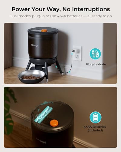 Dual Power Options: Operates via USB or 4 AA batteries (included), ensuring uninterrupted use as a cat automatic feeder and dog automatic feeder even during power outages.