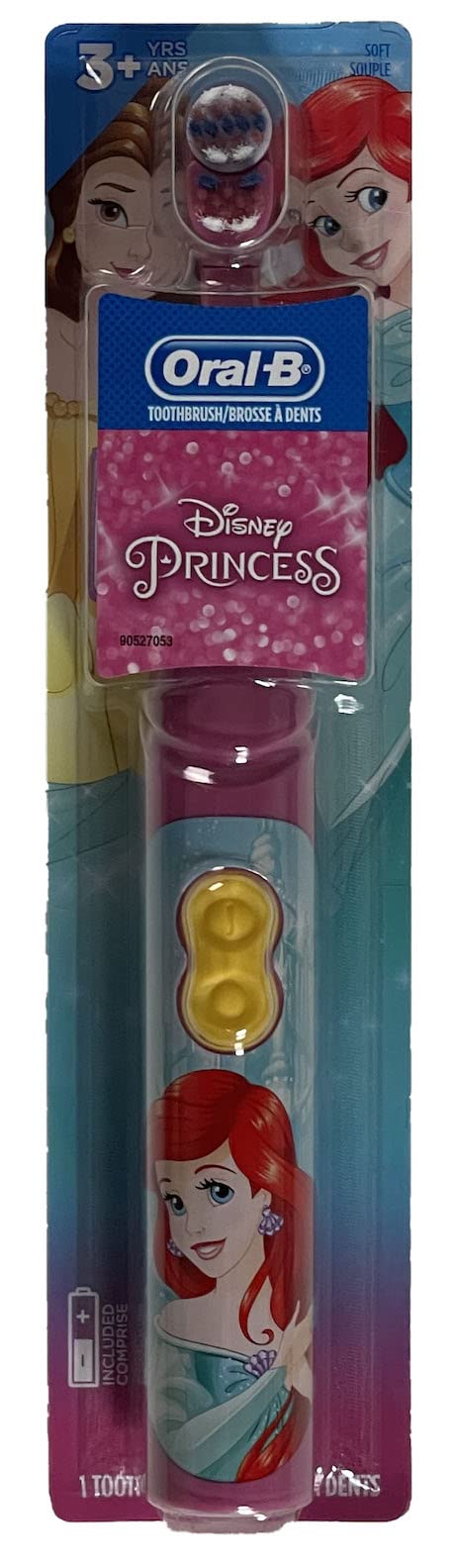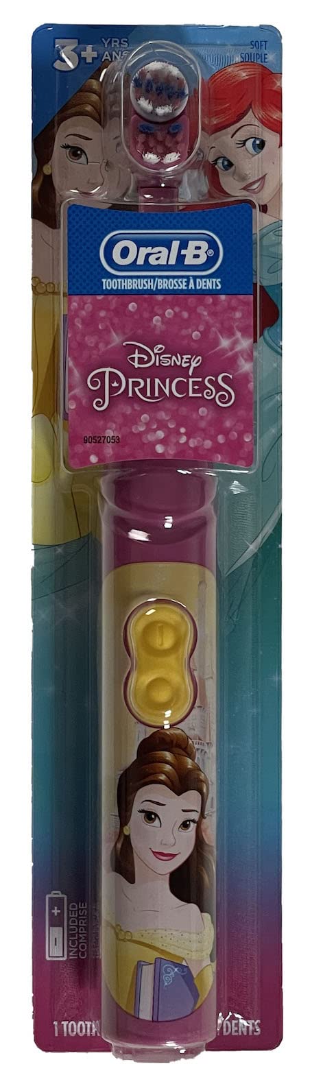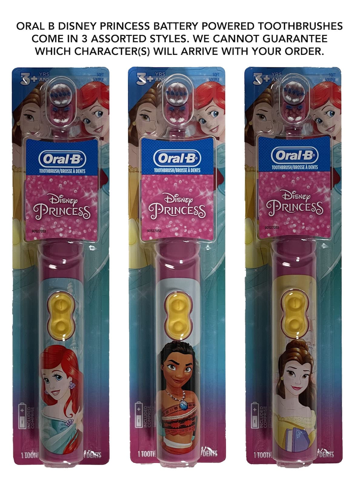 2 Pack of Oral B Disney Princess Battery Powered Toothbrushes. Oral B manufactures the toothbrushes with three different styles of artwork featuring Belle, Ariel, and Moana. The Disney Magic App Timer is included with each toothbrush. The app allows your children to uncover exciting new characters when they brush for the doctor recommended duration for their age. The toothbrush has a raised center section to effectively clean chewing surfaces where cavities tend to form. The new generation of these brushes lasts 2 times longer than the previous. The battery is replaceable, but the brush head is not. It is recommended that the brush be replaced every 3 months. We cannot guarantee a specific character will come with your order or if you will receive two different versions.