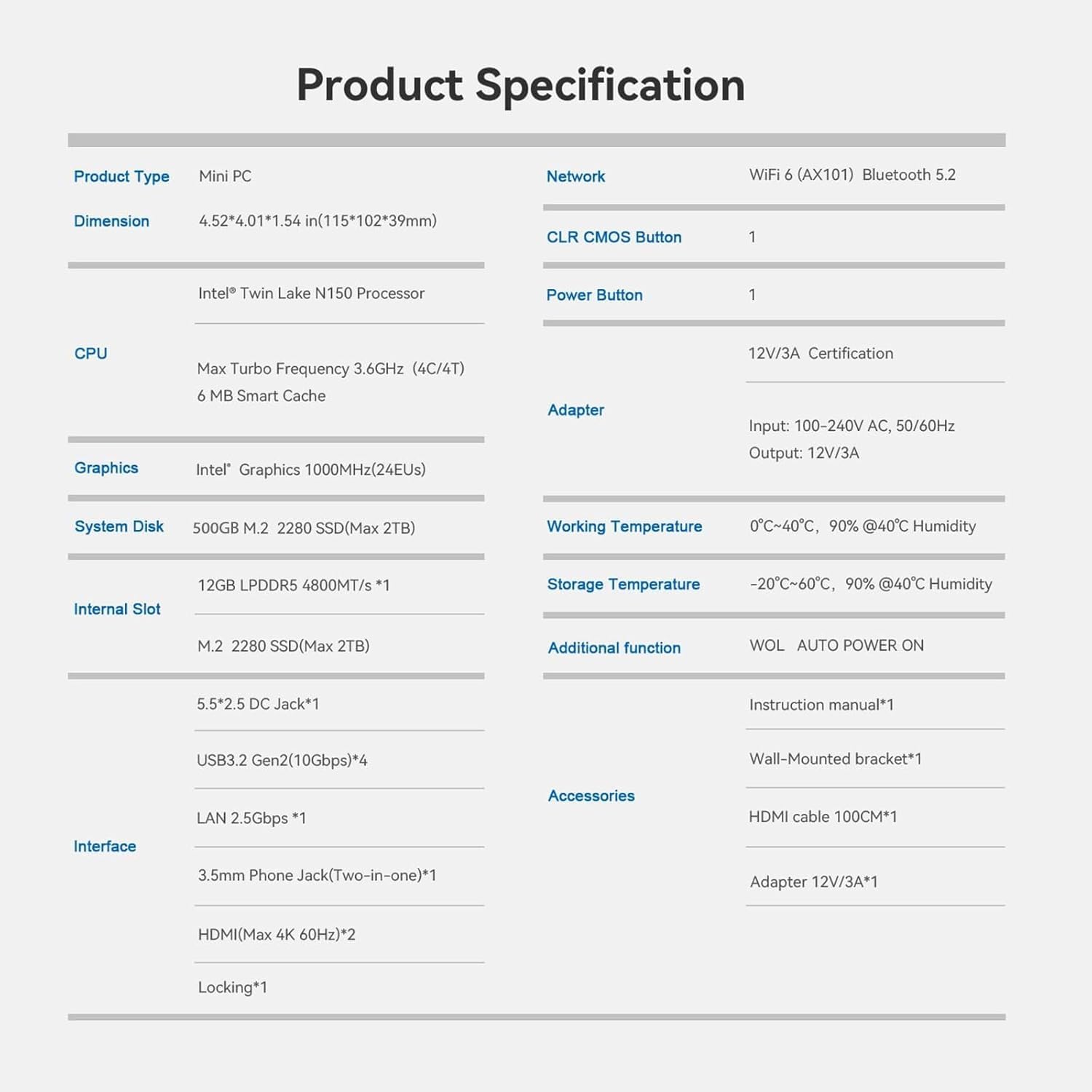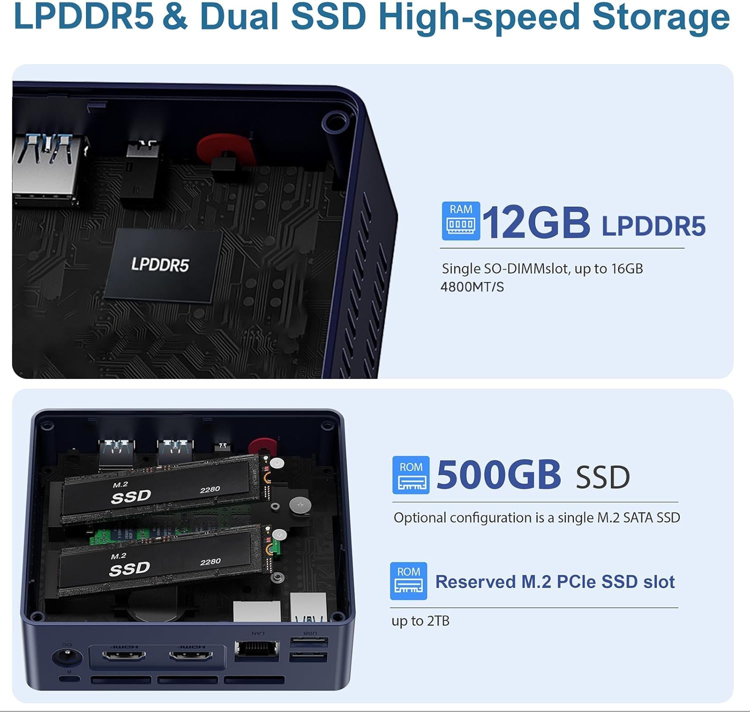 【12GB LPDDR5 + 500GB SSD】The mini pc is equipped with 12GB LPDDR5 4800MT/s for faster multitasking and smooth application switching. The 500GB M.2 NVMe SSD ensures fast boot times, rapid file transfers and ample storage space, eliminating slow loading times and ensuring snappy responsiveness. An additional M.2 PCIe 3.0 x1 interface (up to 2TB) is equipped to meet various usage needs