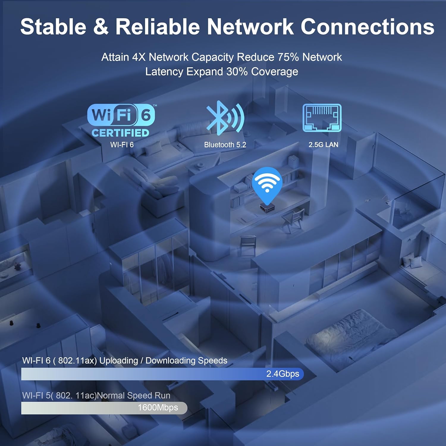 【High-Speed and Stable Network】The mini desktop pc built-in 2.5G LAN port and supports Wi-Fi 6 (AX101) for ultra-fast wireless connections, enabling smooth streaming and speedy downloads. Compared with Wi-Fi 5, Wi-Fi 6 is nearly 3 times faster, you can have a dedicated and undisturbed channel when playing games. Built-in Bluetooth 5.2 allows for effortless pairing with various peripherals, such as wireless keyboards, mice, earphones, monitoring camera, printer, monitor, TV, projector etc
