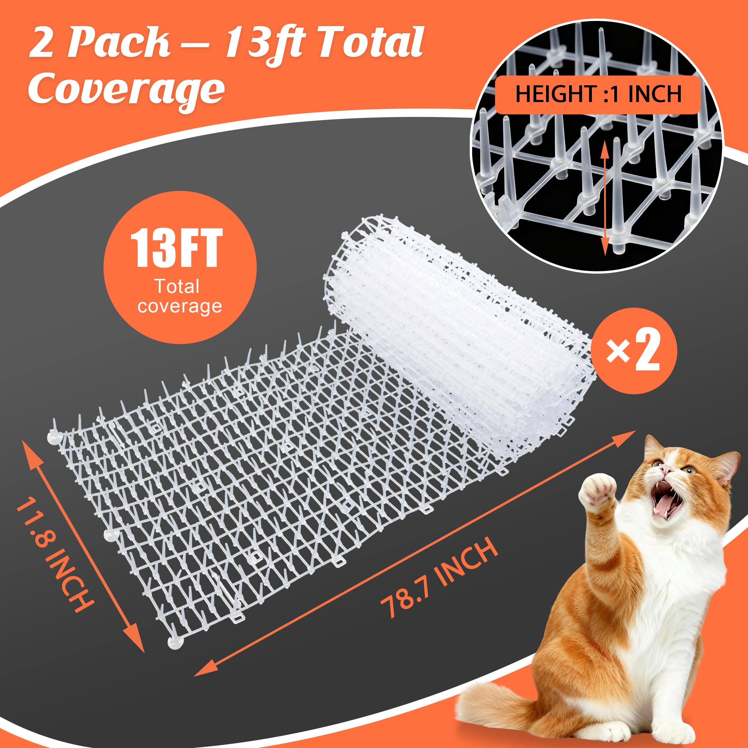 【2 Pack, 13ft of Clear Protection for Multiple Areas】 – This set includes two 78" x 11" transparent cat scat mats, giving you 13 feet of total coverage. Use one strip on sofas or window sills and the other along balcony rails, hallways or garden borders, or join both together to create a longer continuous barrier for stubborn problem areas.