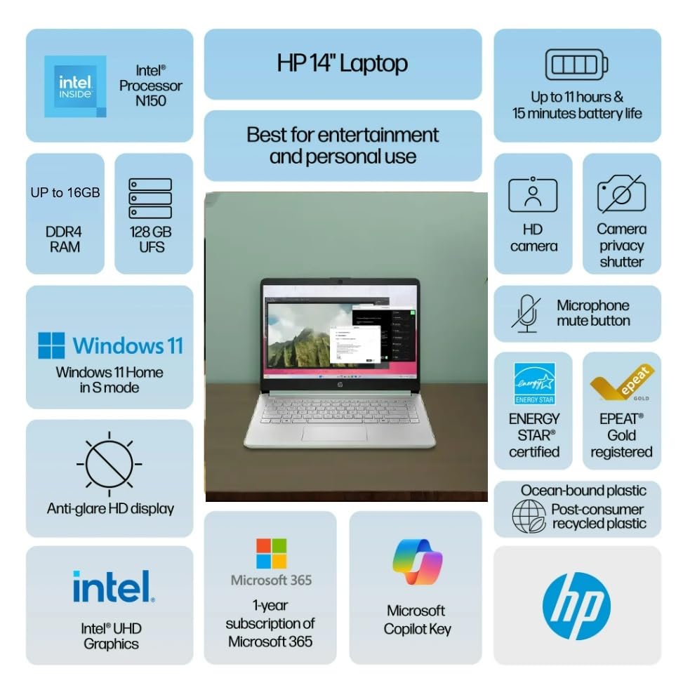 HP Student Laptop, Intel Processor N150(up to 3.6 GHz),14 Inch LED Screen, 8G RAM, 256GB Storange (128GB UFS+128GB MSD),1 Year Office 365, Windows 11 Home, Willow Green,w/BTP Accessories