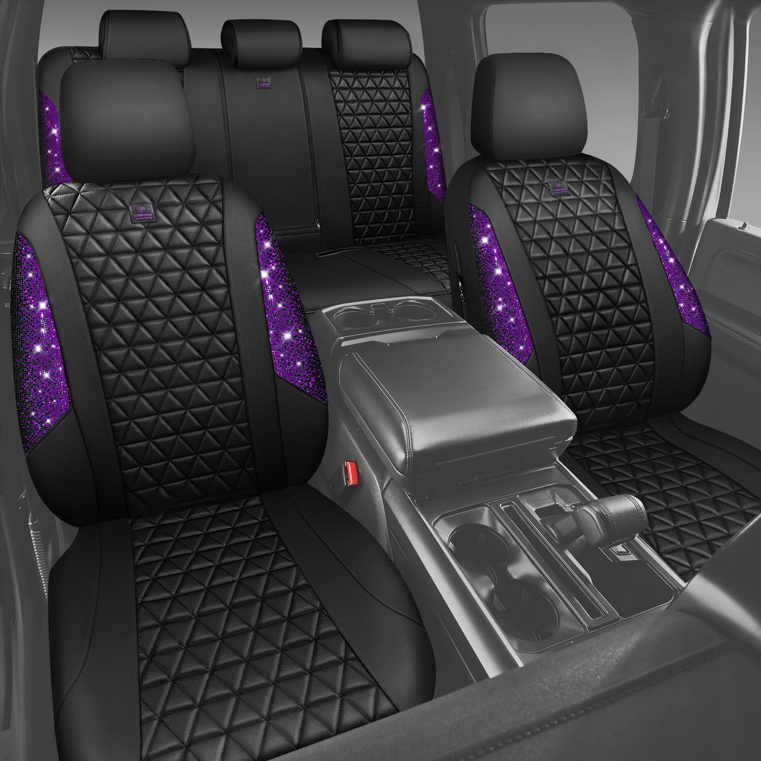 UNIVERSAL SPARKLY DIAMOND - Refresh your car if you install the bing bling crystal diamond leather seat covers, water resistant material. Surface rhombic texture design lined sponge soft and comfortable. Fit for most SUV Sedan Pickup coupe automobile vehicle seats with adjustable headrests. Can be installed with the detachable headrests. Easy to install, with installation manual, can be installed in 10 minutes