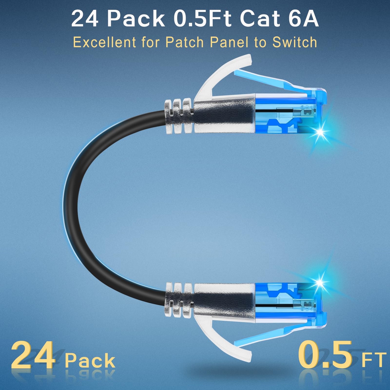 CAT6A Patch Cable 24 Pack: UTP 28AWG stranded conductors for flexibility, Twisted pair cable is corrosion resistant and non-crosstalk, is a convenient and affordable option.