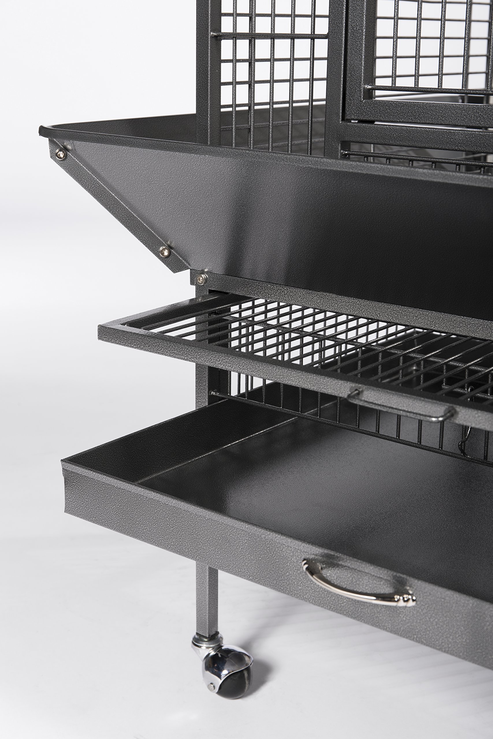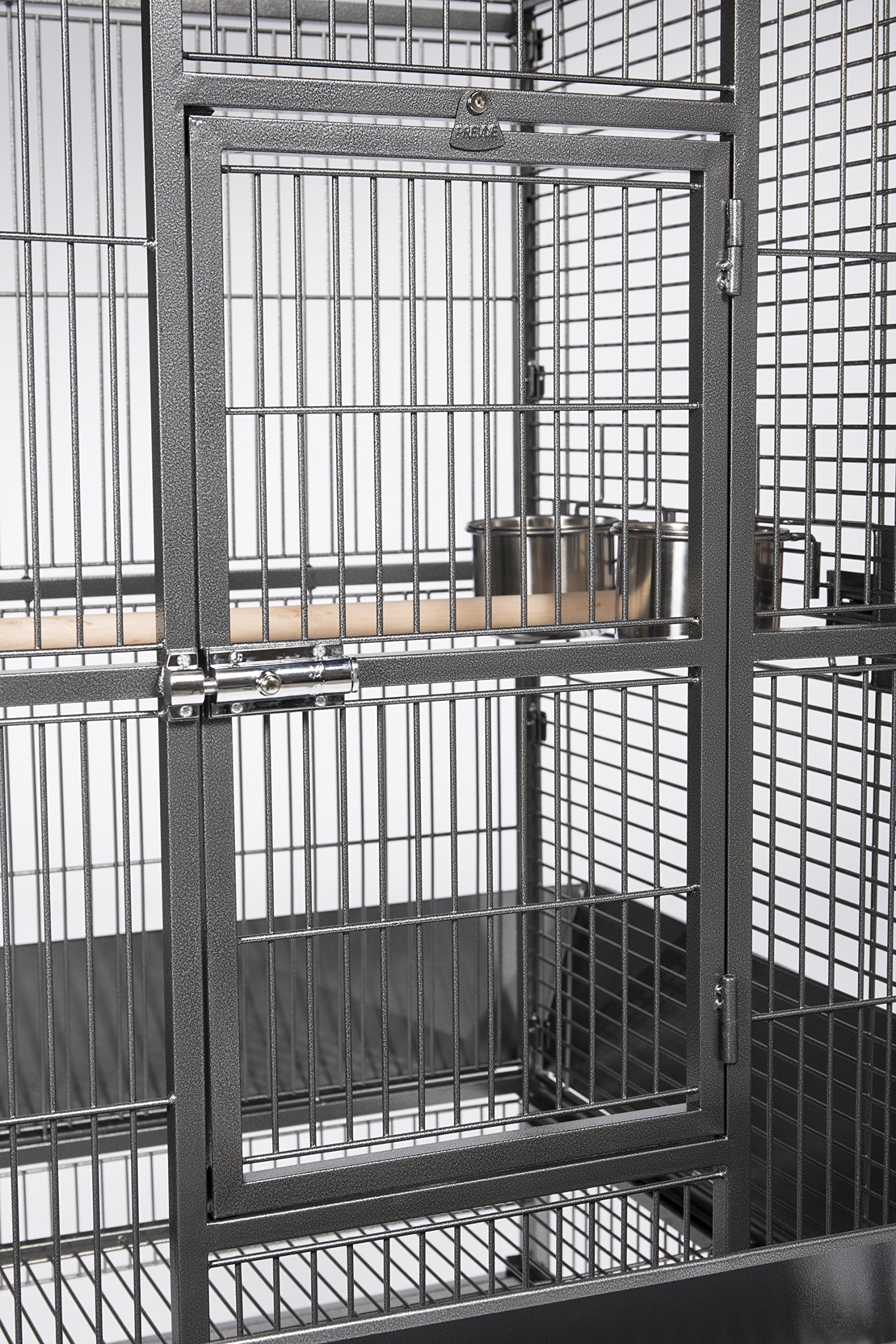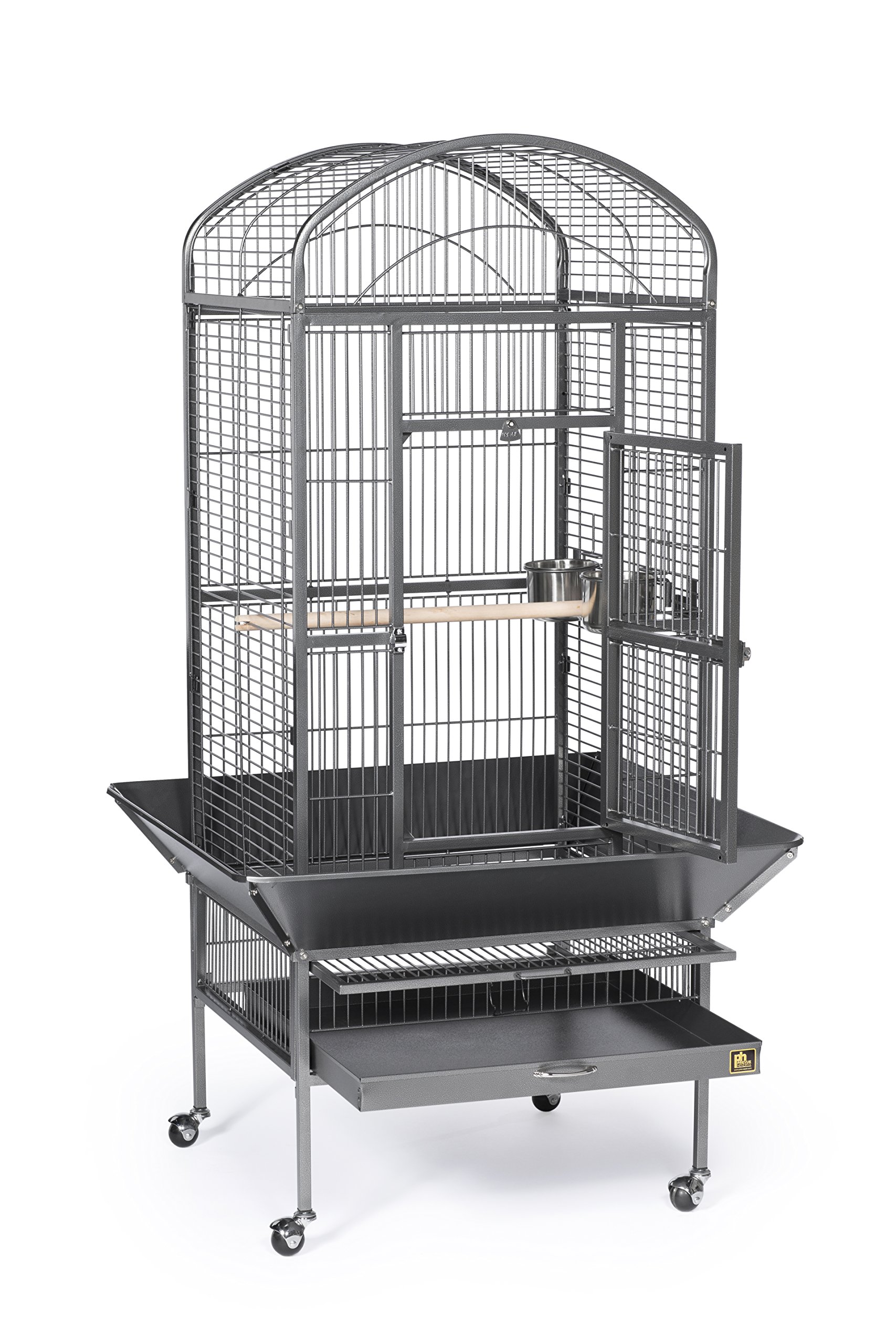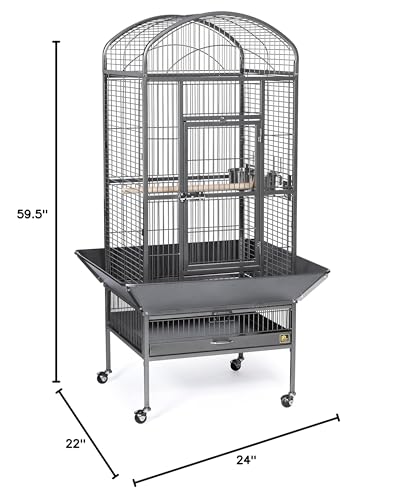 Prevue Pet Products Medium Dome top bird cage Black Hammertone 34521 features a roomy and refined dome top roofline with Extra space for hanging toys and letting your bird stretch its wings. Expertly engineered in the USA to be easily assembled and loaded with owner, and bird, friendly features, our wrought iron constructed cage offers quality craftsmanship at an affordable price. Rounded corner seed guards help control mess outside of the cage and are less likely to damage walls or catch on your clothing, seed guard measurements are 32 1/4quot; long and 30 1/4quot; wide. Both grille and debris tray are removable for ease of cleaning and the integrated cage stand sits on sturdy, easy rolling casters. The large front access door measures 11 3/4'' long by 21 3/4quot; high and closes securely with a push button lock plus a wind bell lock to prevent any escape artists from pushing the door open. Included with this cage are 2 stainless steel 24 oz. Food/water cups, which lock into place within the 4quot; long by 6quot; high cup doors and a generously sized 7/8quot; wooden perch. Finished with a durable and elegant Black Hammertone powder coating, Prevue cages undergo independent lab testing and conform to the highest levels of pet safety. Prevue Pet Products Medium Dome top bird cage Black Hammertone 34521 is constructed from 9 amp; 10 gauge wire and measures 24quot; long, 22quot; wide and 59 1/2'' high with 3/4quot; wire spacing.
