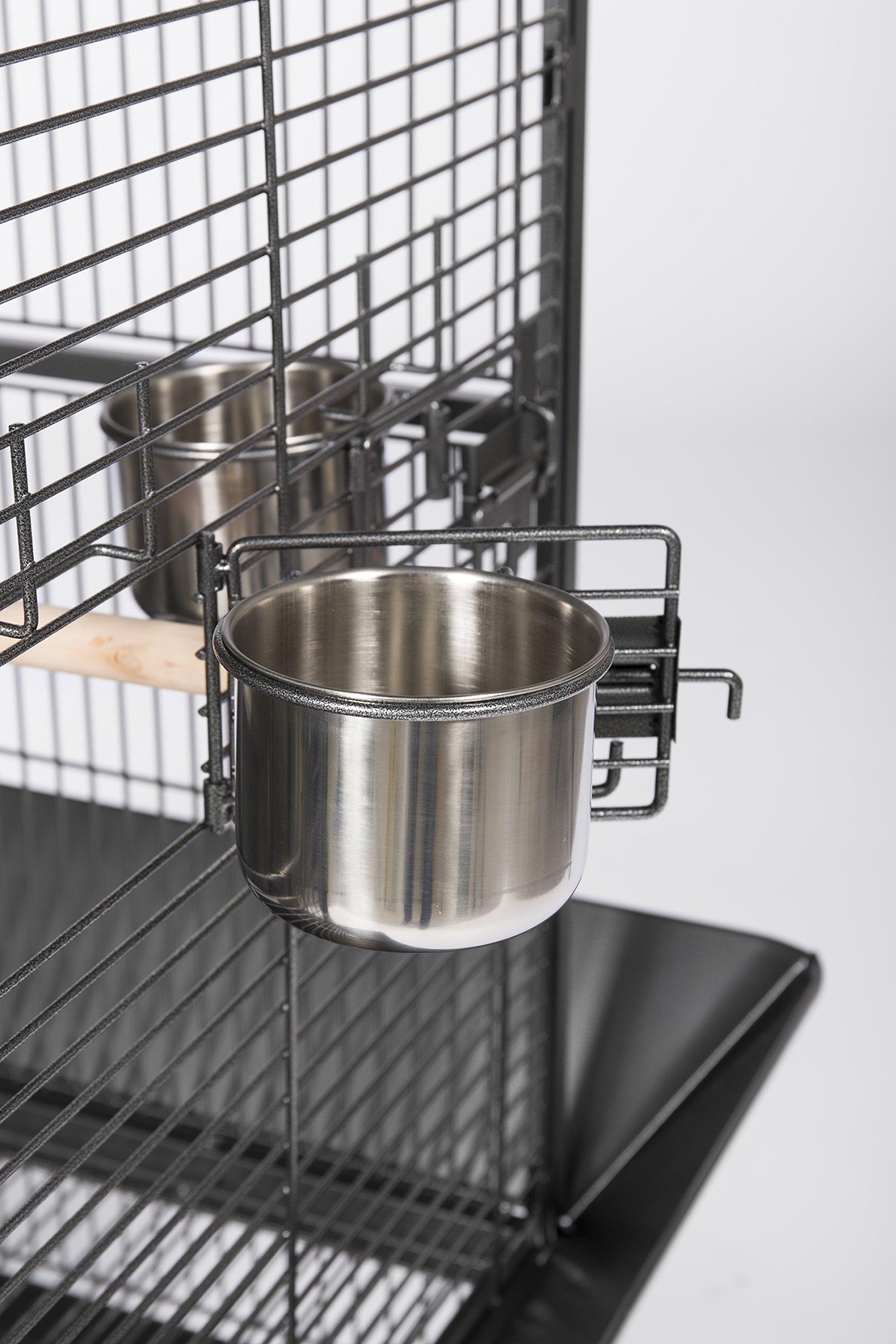 2 Stainless steel 24 oz. Cups, a wood perch and rounded corner seed Guard set are included