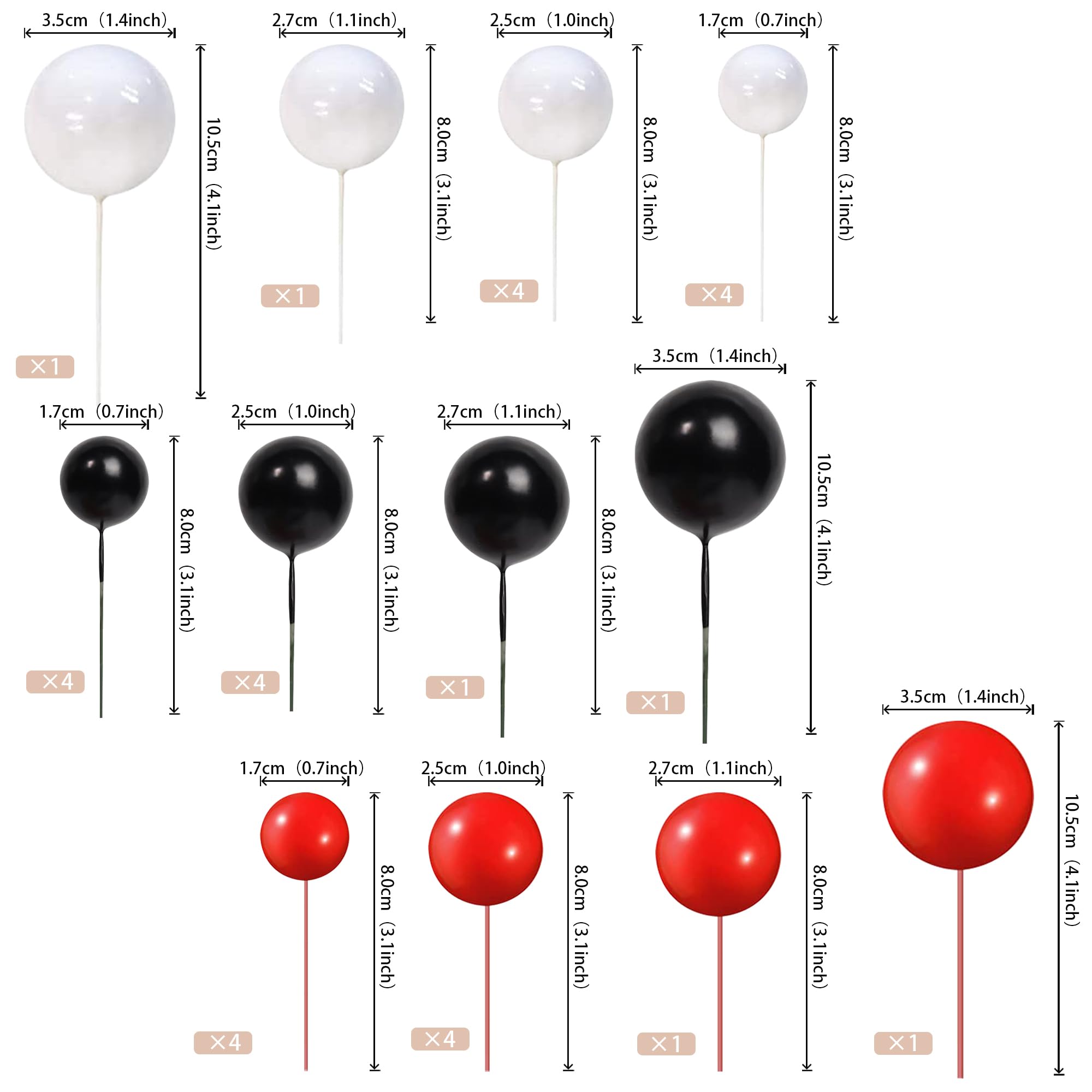 Enough Quantity and Proper Size ! You will get total 24 pcs, 2 cm diameter ( 9 pcs ) + 2.5 cm diameter ( 9 pcs )+ 3 cm diameter ( 3 pcs )+4 cm diameter ( 3 pcs ),ample quantity can meet your different decoration needs. you can use them to decorate your cake with different size balls.