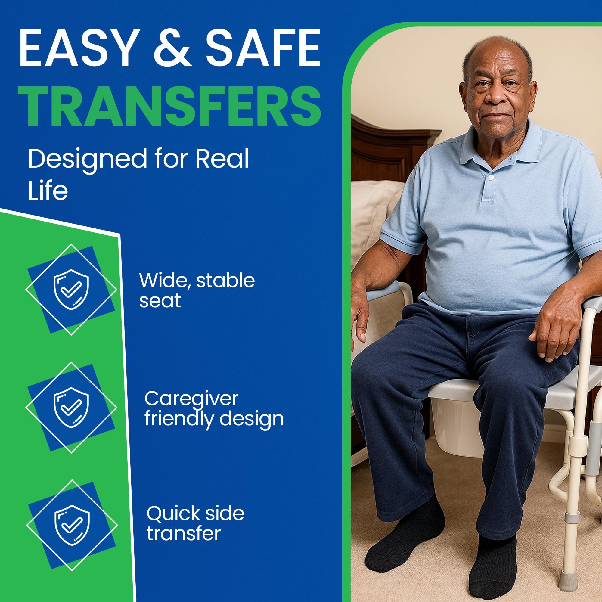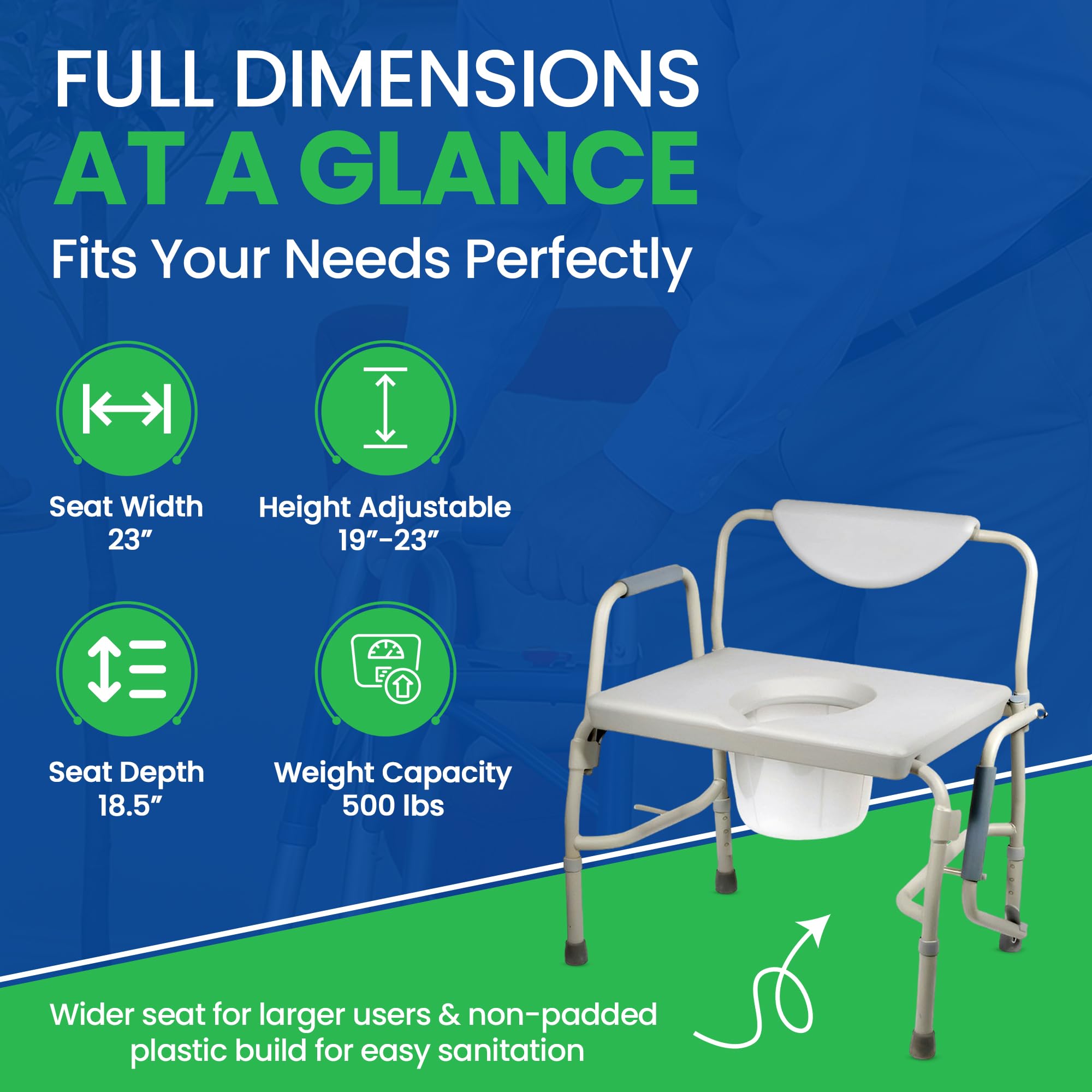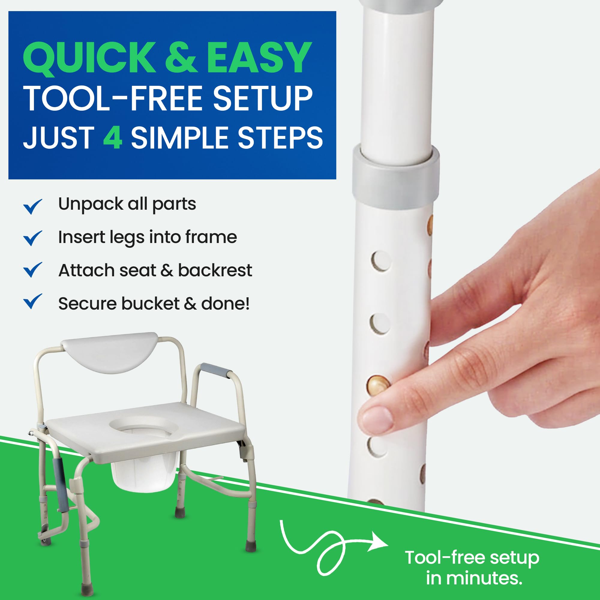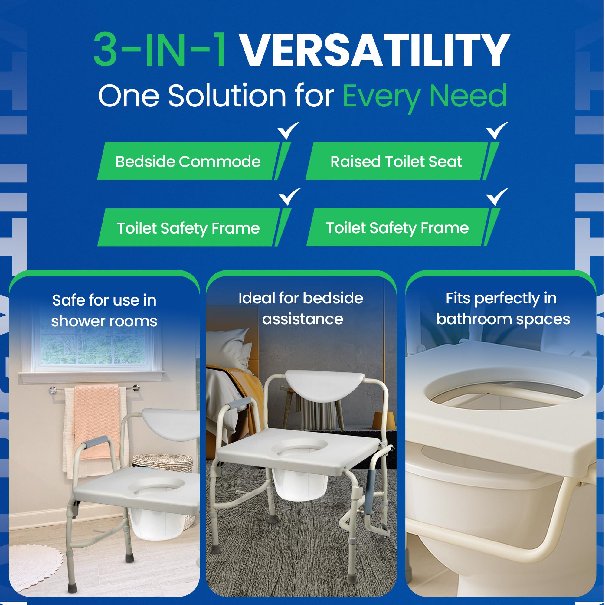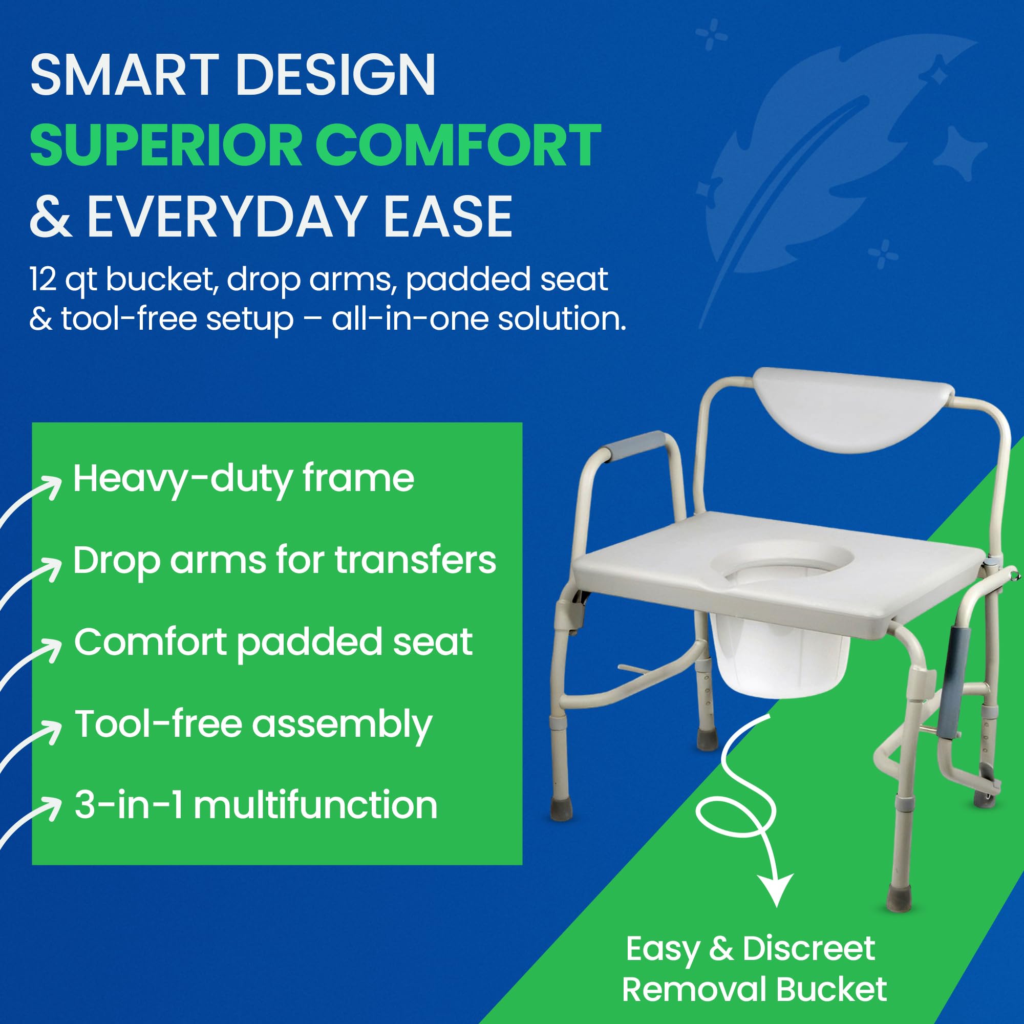 WIDE RANGE OF USE This bariatric bedside commode with drop arm can be used as a toilet safety frame, elevated toilet seat, bedside commode or placed over your existing toilet