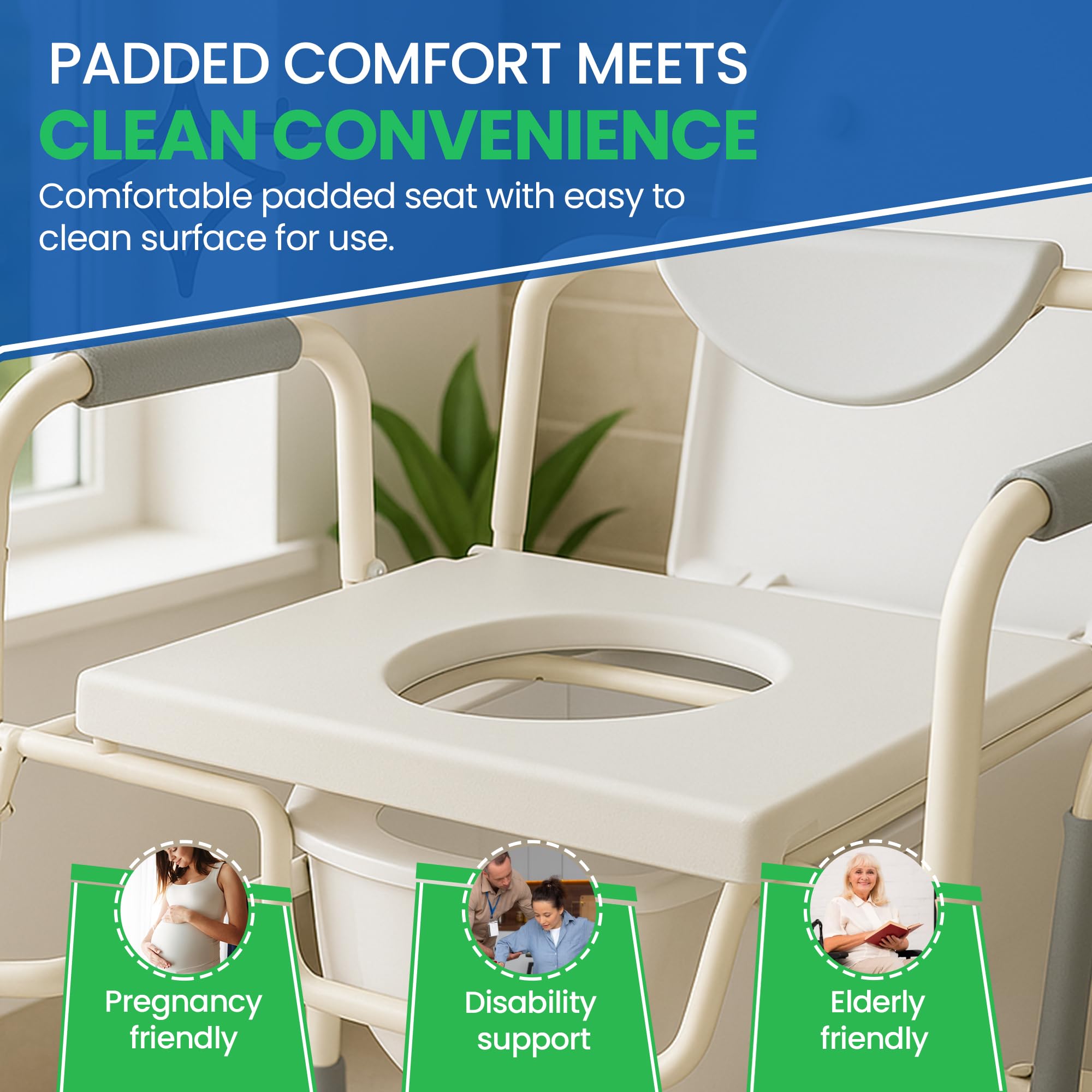 COMPLETE WITH A BUCKET Comes complete with a 12 qt commode bucket and cover that removes from behind