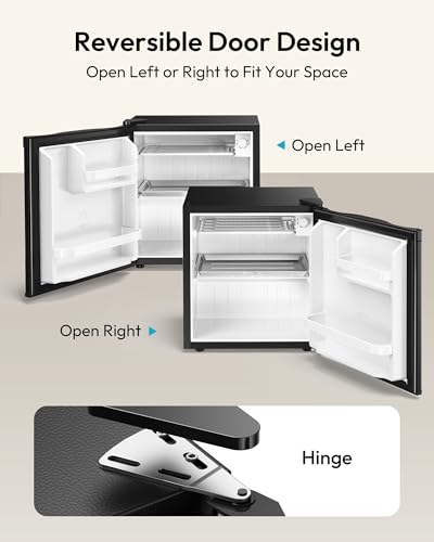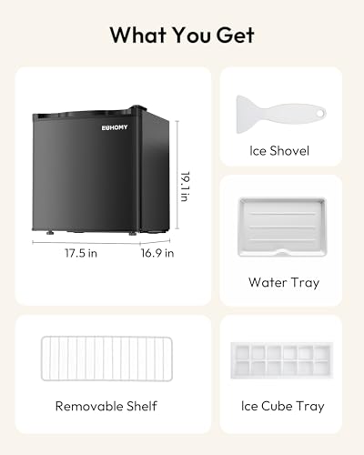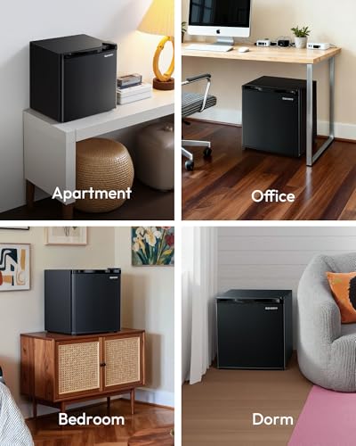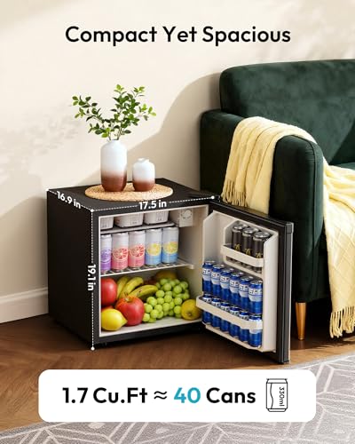 COMPACT & PORTABLE - This mini fridge has a compact shape (16.9"D x 17.5"W x 19.1"H), whether it's placed on a countertop or under a desk, it fits perfectly. We also designed this mini fridge for bedroom with left and right door opening, just simply remove and install it, good for apartments, dormitories, offices and bedrooms