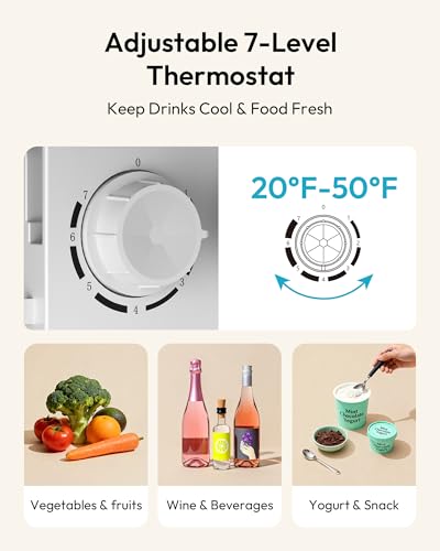 TEMPERATURE CONTROL & INSULATION - This mini fridge for office has a stable temperature control system, it is built-in a 7-speed adjustable temperature control knob (32℉-50℉), the wide temperature range is enough to meet most of the daily needs. High-density foam layer embedded in the dorm fridge body effectively insulates the heat and facilitates long-lasting heat preservation