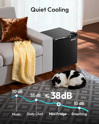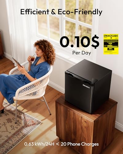 ENERGY SAVING & QUIET - The mini refrigerator features a highly efficient and low-consumption compressor that uses only 0.55 kWh per day, ensuring optimal cooling with minimal energy consumption. The compact fridge operates smoothly and quietly, with a noise level of less than 38dB, making it suitable for use in any location